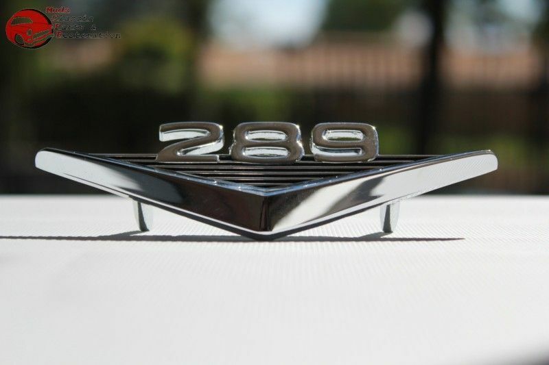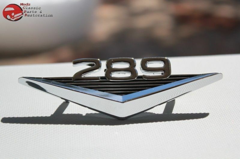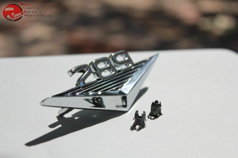 Also a nice dress up badge for any custom Ford 289 build; Emblem is 4 1/2" x 1 3/8" w/2 1/4" gap between the studs; Mounting clips included; Chrome plated zinc die cast
