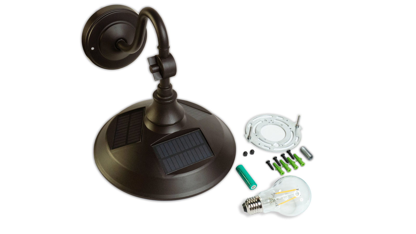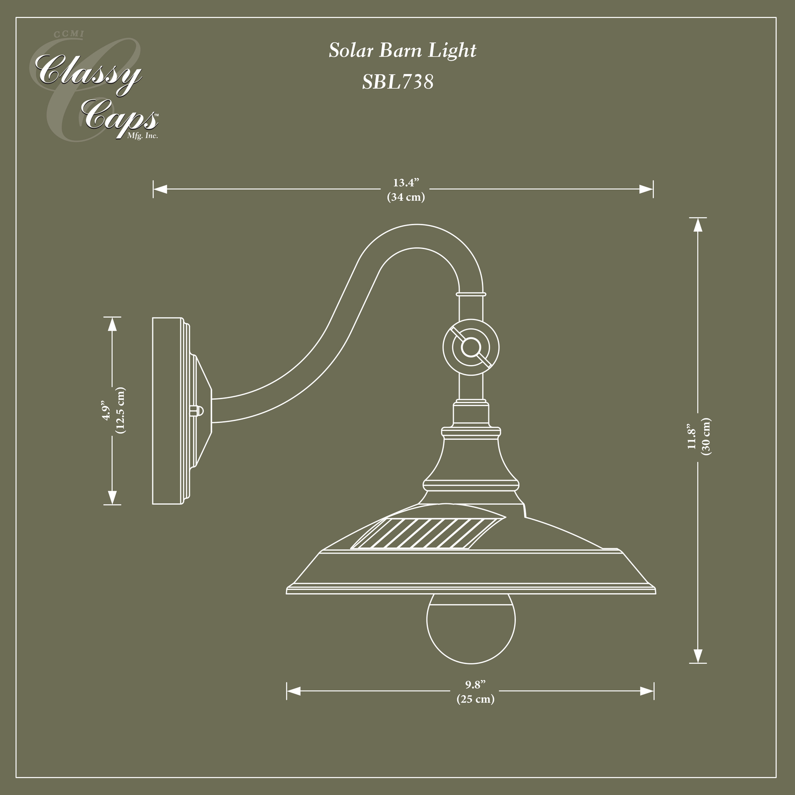 The Classy Caps Vintage Solar Barn Light offers new technology while maintaining the design and characteristics of a classic barn light - no more unsightly wires or separate solar panel required. Classy Caps solar barn light is manufactured from the highest quality materials offering durable dark bronze matte coated aluminum housing and wall plate with metal hook, 3.2 V rechargeable battery, PCB solution to conserve charge and maintain longer working time during cloudy days, On/Off switch and Edison style LED bulb for warm natural light is included. Add the Classy Caps elegance to your porch, garage, shed, barn or anywhere country charm is desired....A new and innovative design only by Classy Caps Mfg. Inc.