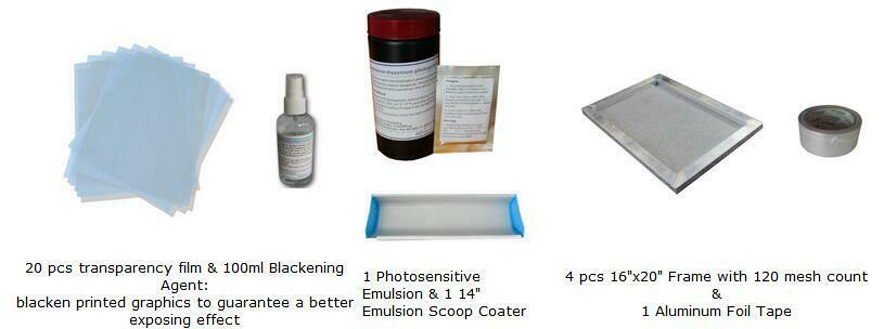 This kit is especially designed and equipped for new hand to learn and do your DIY screen printing. Except for the screen printing equipments, it nearly includes all the materials for doing T-shirt screen printing; Another important thing is that we will also provide the full set of technical support. Besides, if you want to buy other screen press, screen stretcher, exposure unit, flash dryer and other screen printing equipments, you can also find from our warehouse or just contact with us.