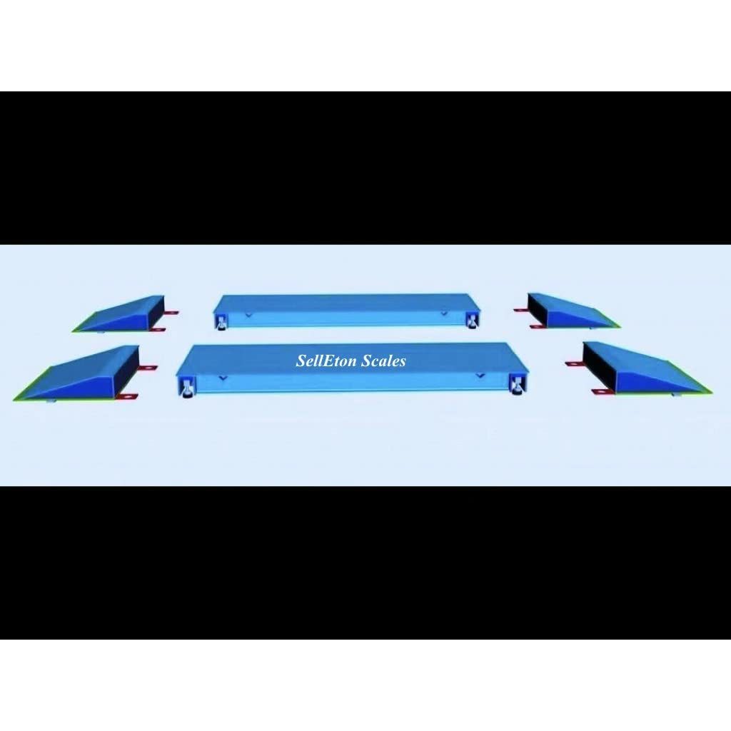 Heavy-duty weighbridges + four ramps set 1/2 deck plate. It weighs the truck / vehicle two wheels at a time, Then adds up total weight. You can also print out a receipt indicating the date, time, weight. The total weight will be summed up by the individual readouts. Equipped with Stainless steel indicator. Scale Sizes: 84 feet (L) x 36 feet (W) x 6 feet(H) 8 large envelope shear beam load cells Stainless steel, with NEMA junction boxes with signal trim board. 15' load cell cable. 8 adjustable swivel steel feet. Calibrated with 12000 divisions 2-year limited warranty!