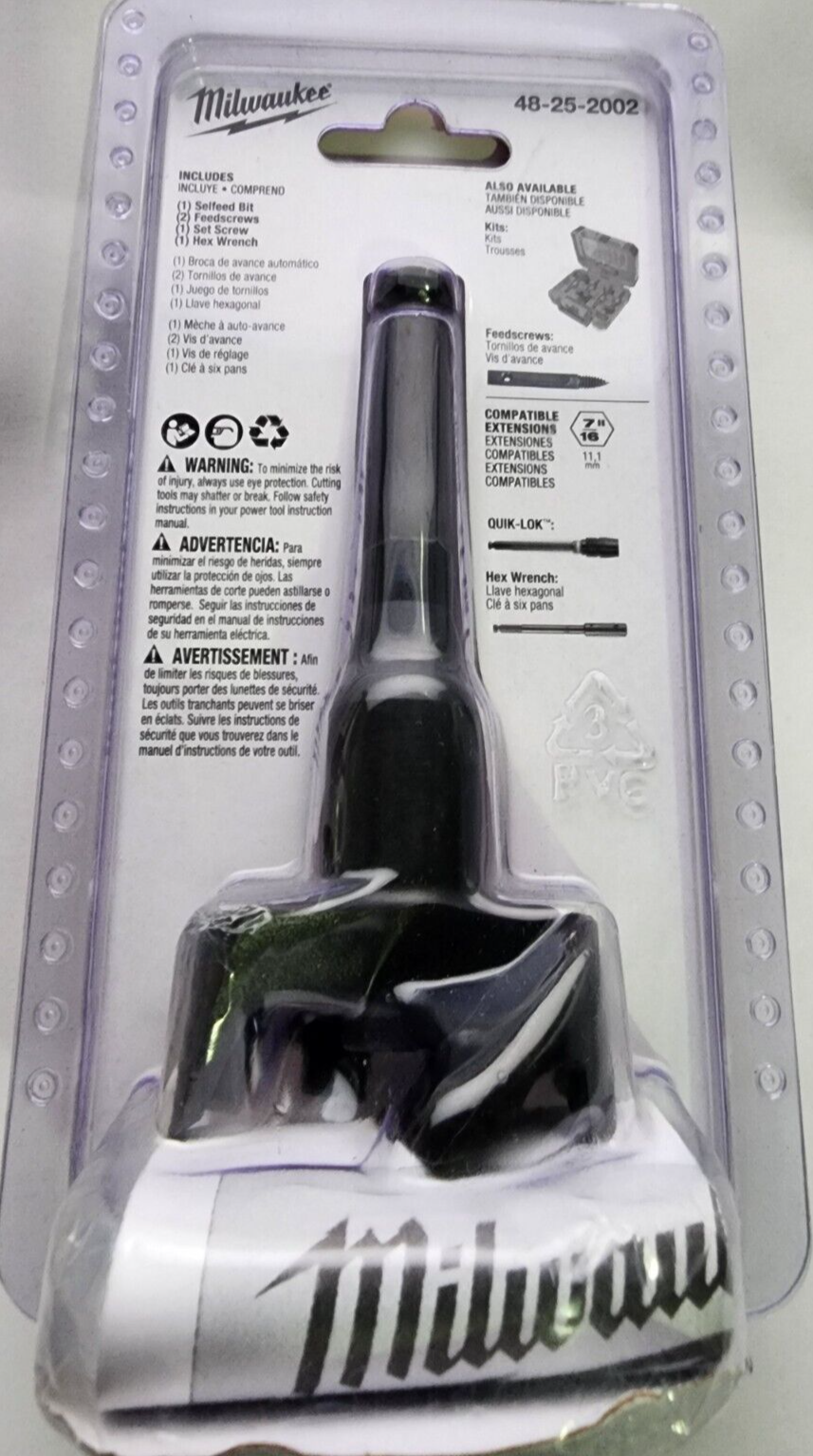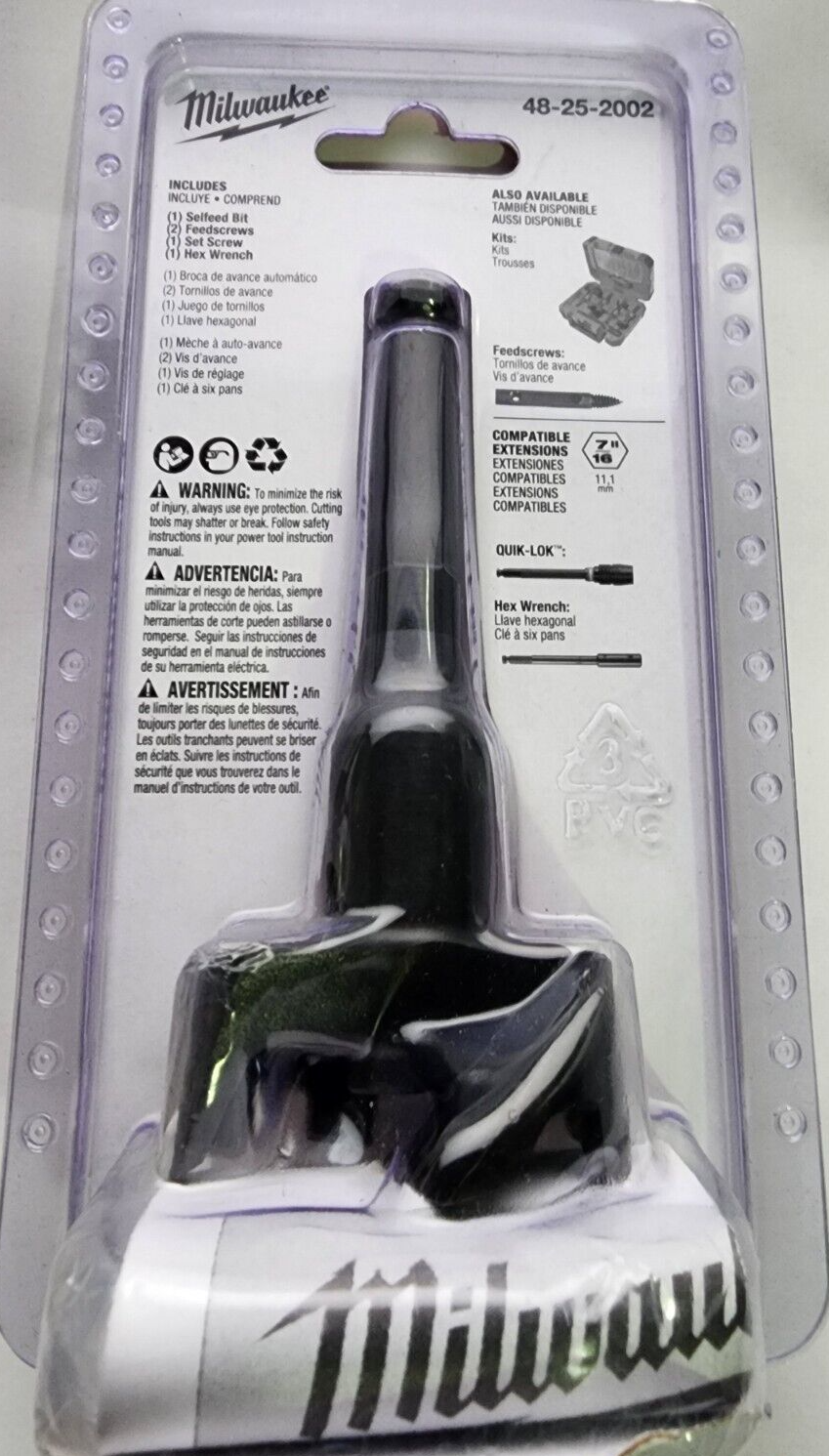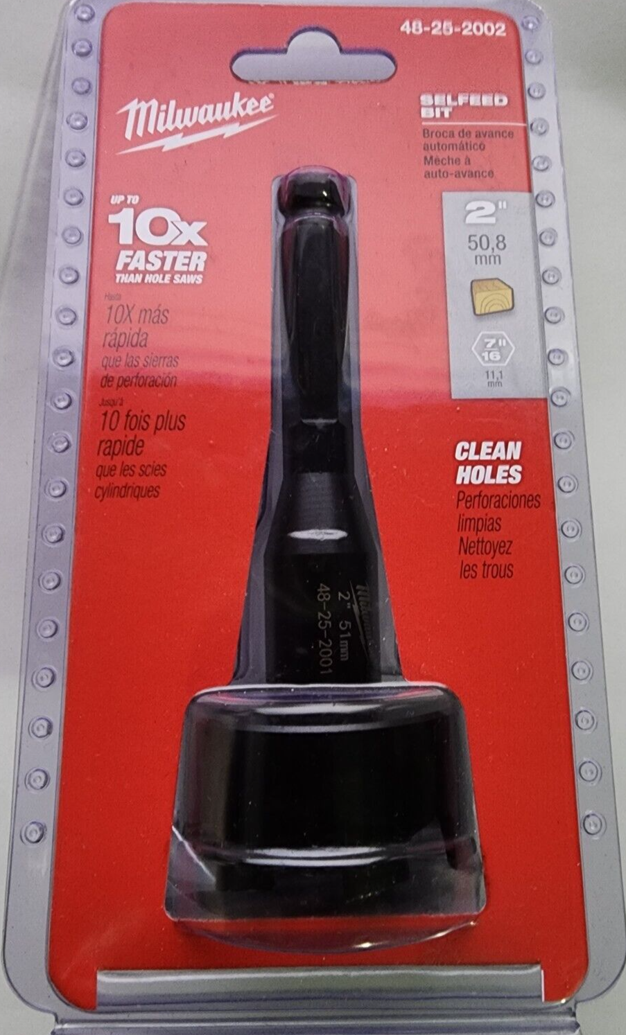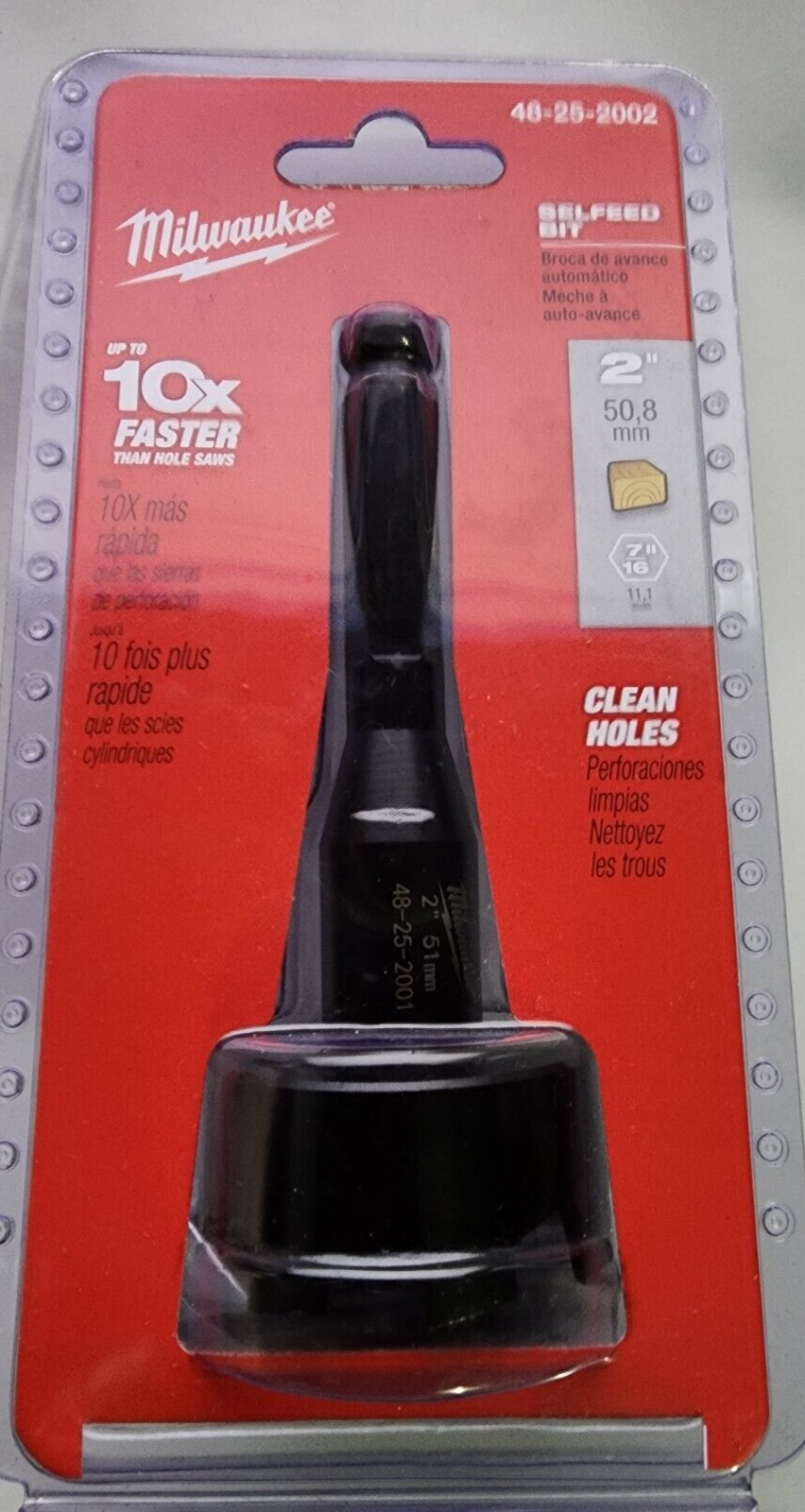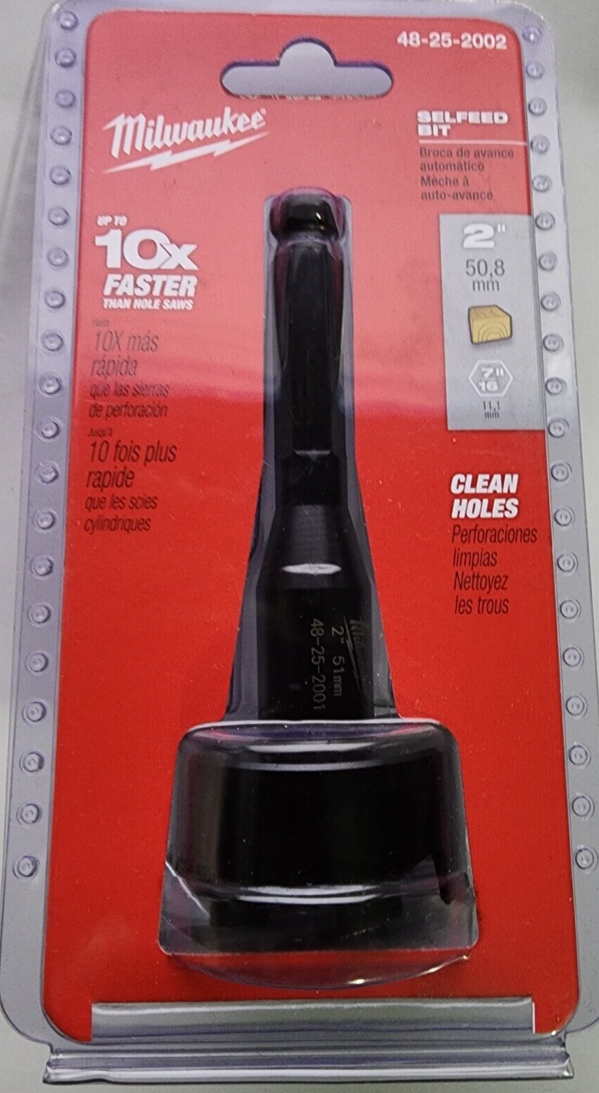 You are Buying a Brand New And Factory Sealed Milwaukee 2 in. Selfeed Bit Milwaukee 2 in. Selfeed Bit Model # 48-25-2002....removable, replaceable feed screw draws the bit into the gummiest of woods. A 7/16 in. hex shank provides a secure gripping surface for the drill chuck. The bit is coated with a rust inhibitor.