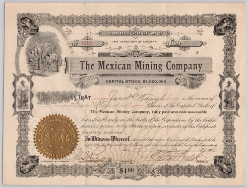 Tuolumne Copper Mining, Capital Stock Certificate, 100 Shares, State of Arizona