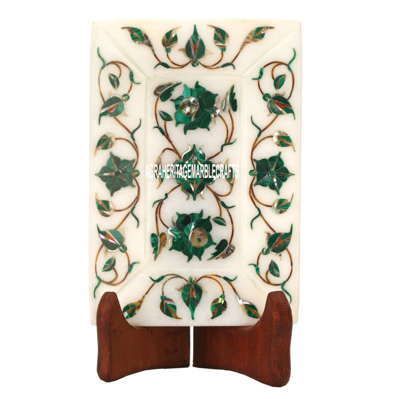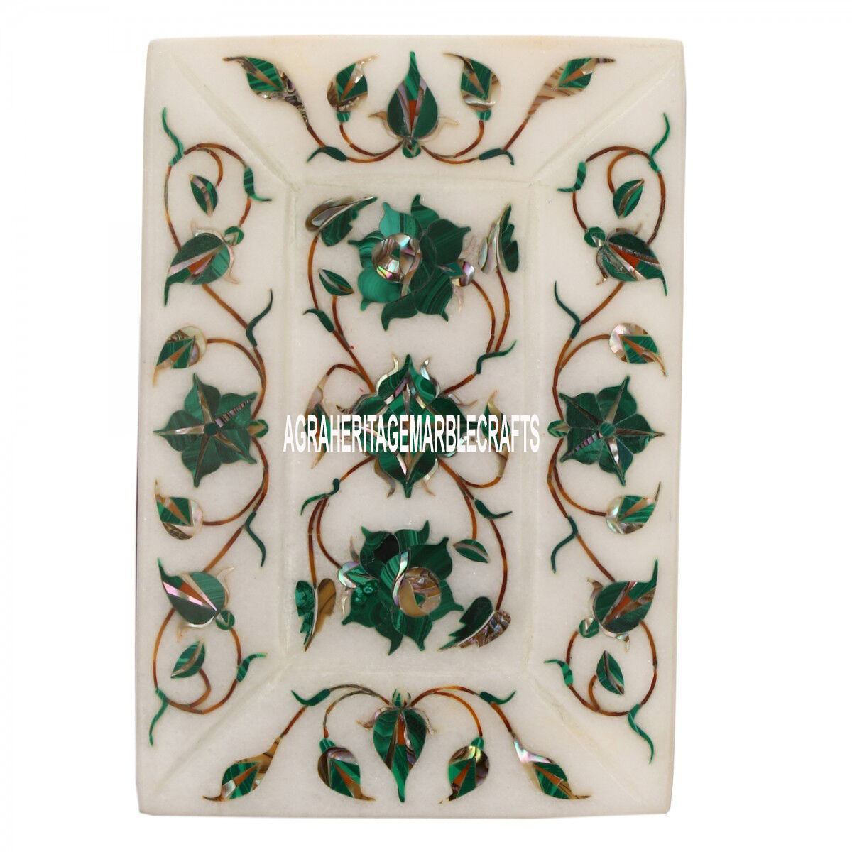 5''x3.5'' White Marble Rectangular Tray Malachite Floral Inlay Patio Decor H3651