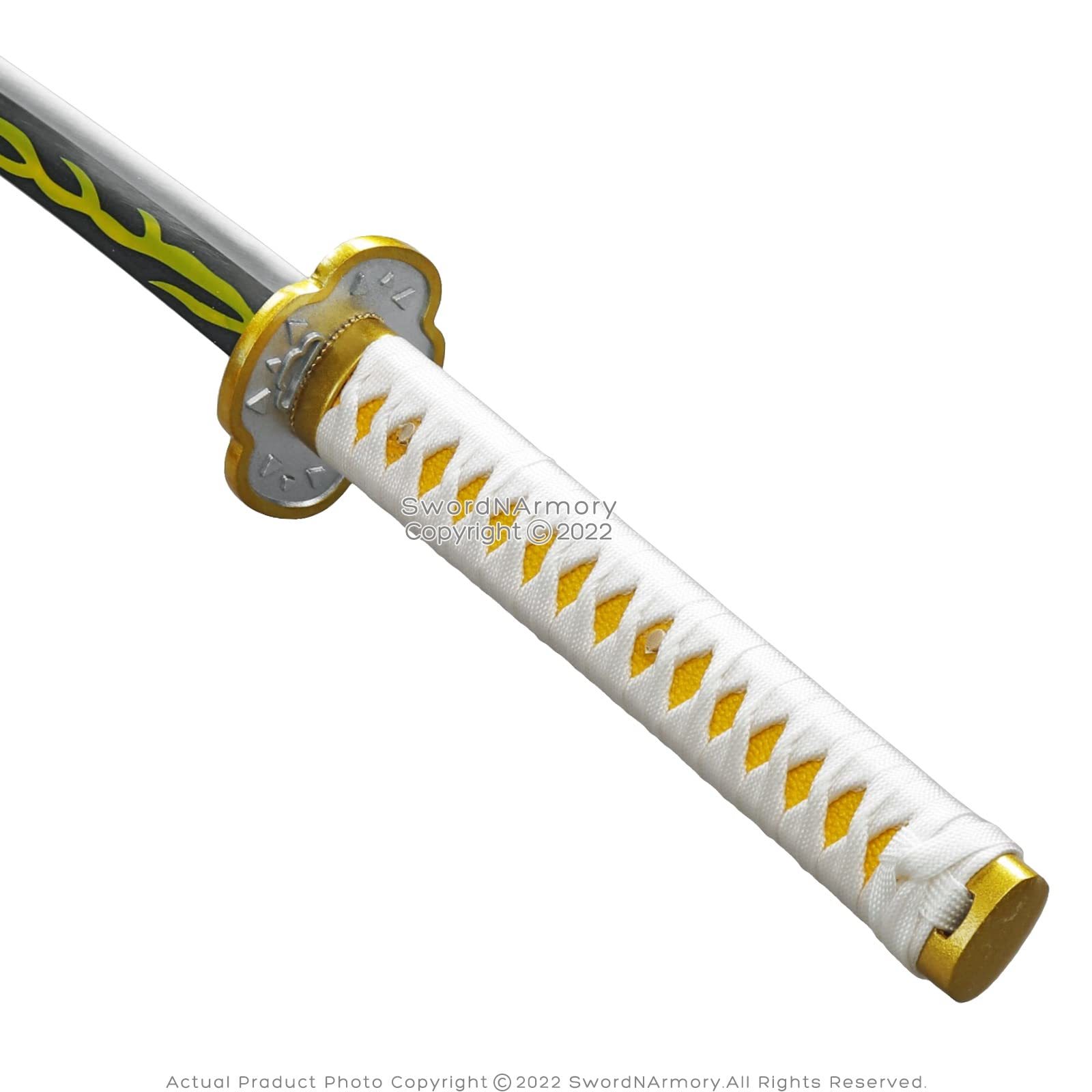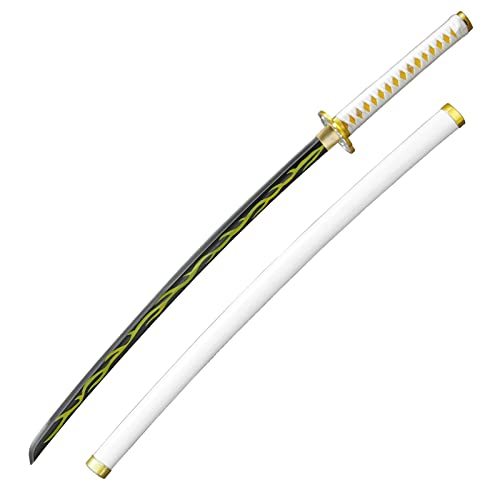 Product description: A clap of thunder rolls through the night, echoing off the mountain tops; another demon has been defeated. This steel katana is authentic to the hit anime and manga, and is perfect for decorating your otaku den, as well as getting your start down the path to mastering your own breathing techniques. Just keep an eye out for shadows that moon walk in dark corners of society. [Dimensions] Overall Length: 40.5? Blade Length: 27? Hilt Length: 10? Balance Point: 6? Weight: 2.28 lb [Blade] Sharp, full tang, and functional, this 1045 high-carbon steel blade is made for the dojo [Hilt] Yellow Imitation Ray Skin Same is tightly wrapped in white nylon Ito grip [The Cowardly Slayer] Perfect the Thunderclap and Flash with this anime-authentic katana [Quality] All of our products are made of the finest materials, and are packaged securely in our own warehouse