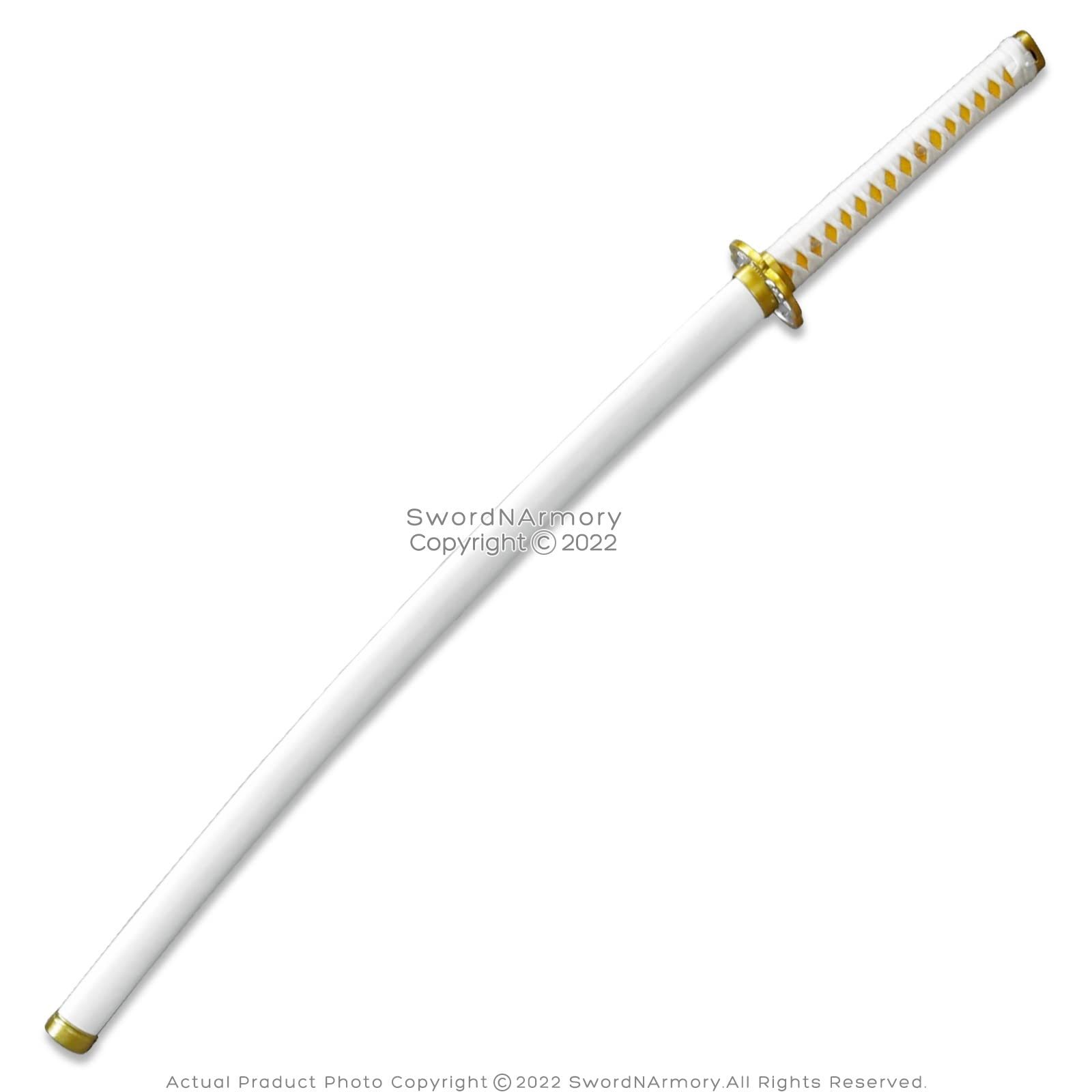 A clap of thunder rolls through the night, echoing off the mountain tops; another demon has been defeated. This steel katana is authentic to the hit anime and manga, and is perfect for decorating your otaku den, as well as getting your start down the path to mastering your own breathing techniques. Just keep an eye out for shadows that moon walk in dark corners of society. [Dimensions] Overall Length: 40.5? Blade Length: 27? Hilt Length: 10? Balance Point: 6? Weight: 2.28 lb [Blade] Sharp, full tang, and functional, this 1045 high-carbon steel blade is made for the dojo [Hilt] Yellow Imitation Ray Skin Same is tightly wrapped in white nylon Ito grip [The Cowardly Slayer] Perfect the Thunderclap and Flash with this anime-authentic katana [Quality] All of our products are made of the finest materials, and are packaged securely in our own warehouse