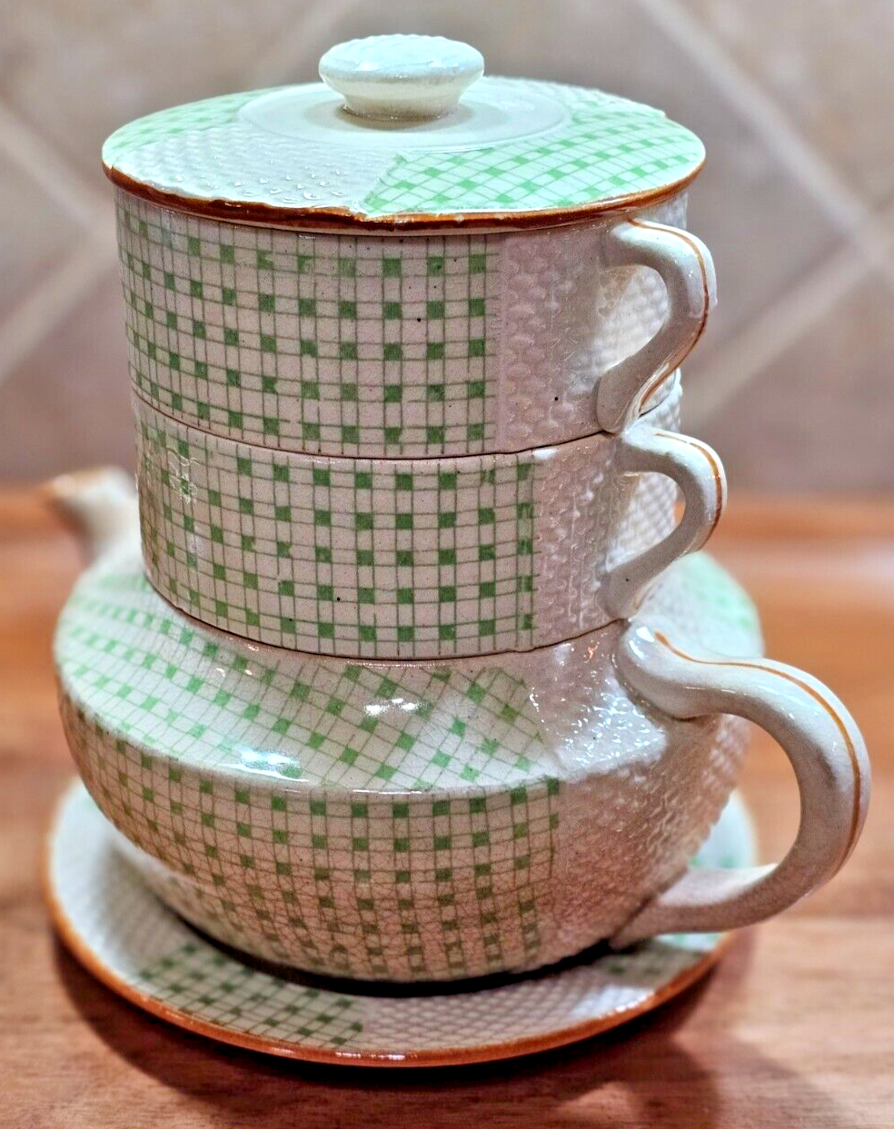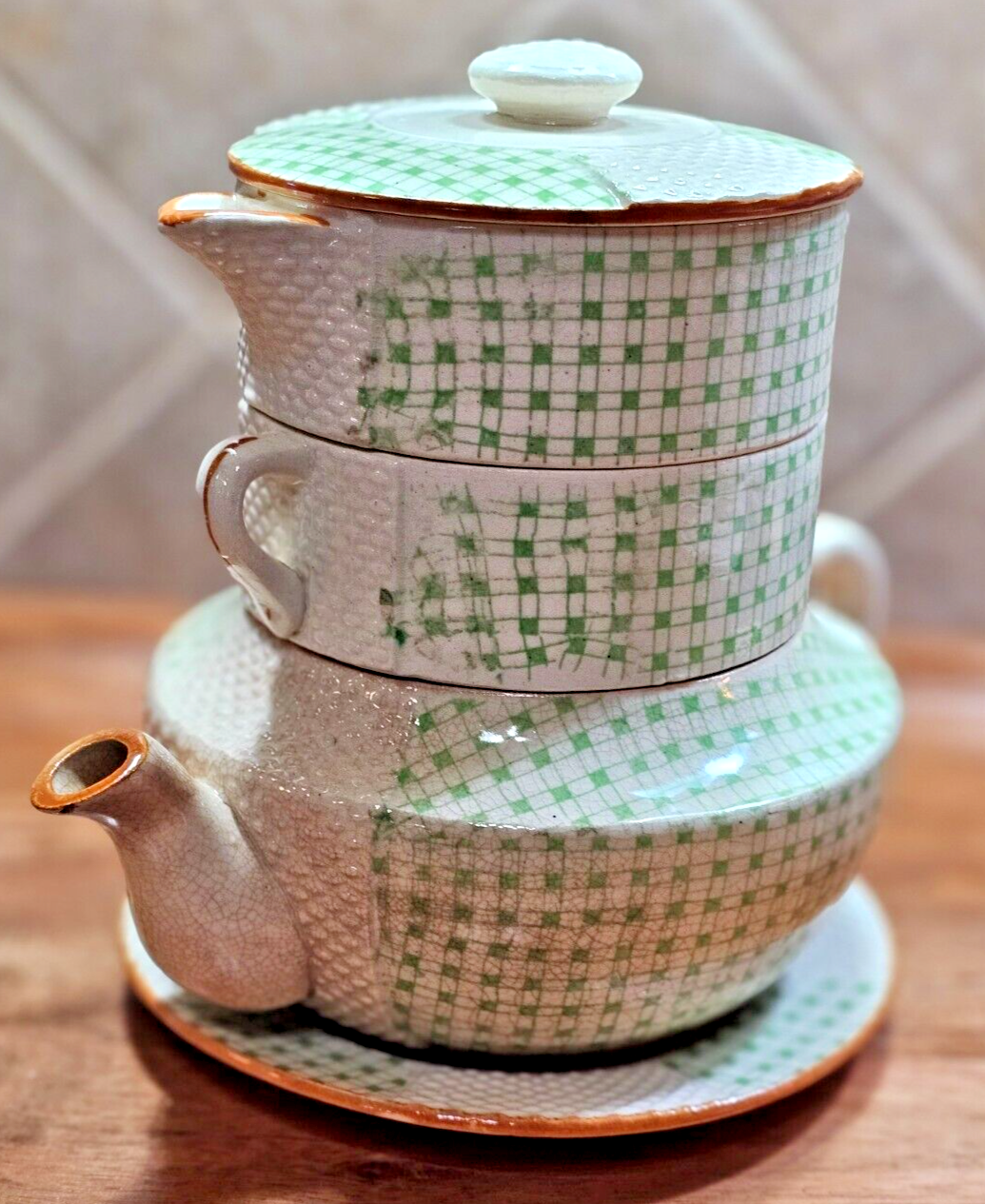 Vtg stackable teapot creamer sugar bowl Japan green checked BSLF