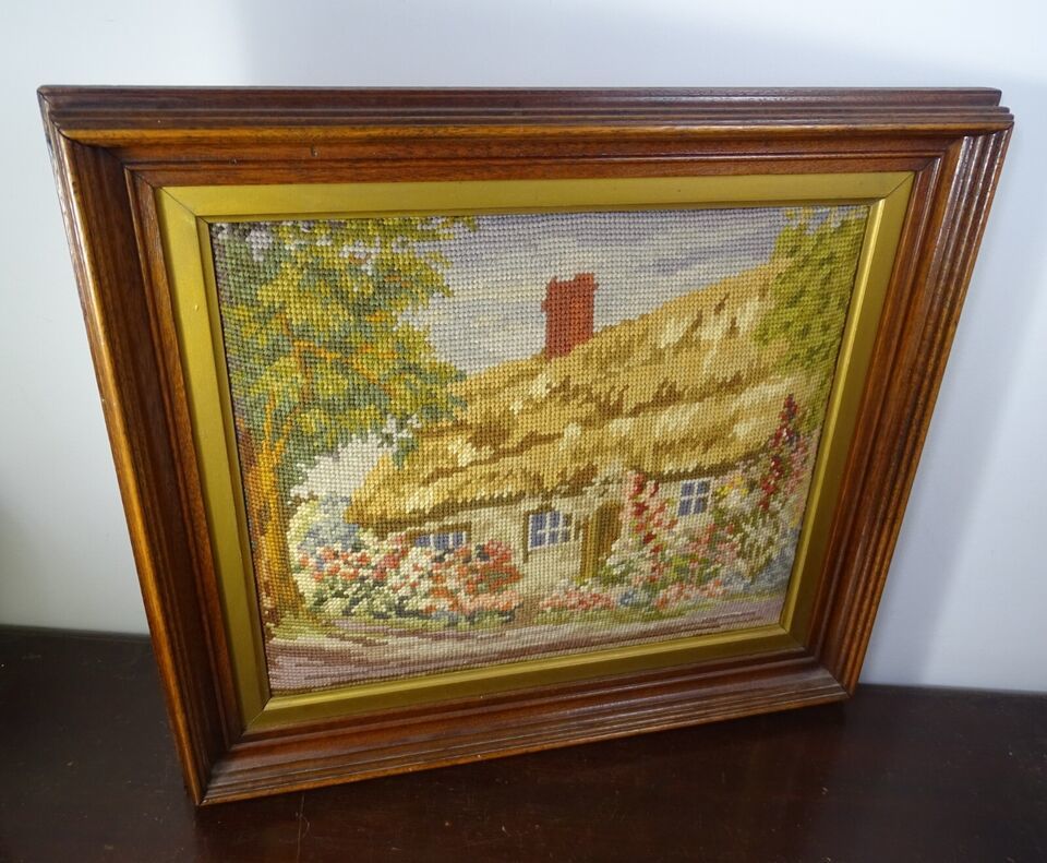 Vintage Wood Framed Needlepoint Art English Cottage features a Thatched Roof in a Flower Garden. Not abused, doesn't appear faded. No damage to frame. One owner item, age unknown but an old item, possibly 1950s but could be older. Image is puffed out a bit with some stuffing behind it. Frame is 16" x 18". Weighs 3 1/2 lbs.