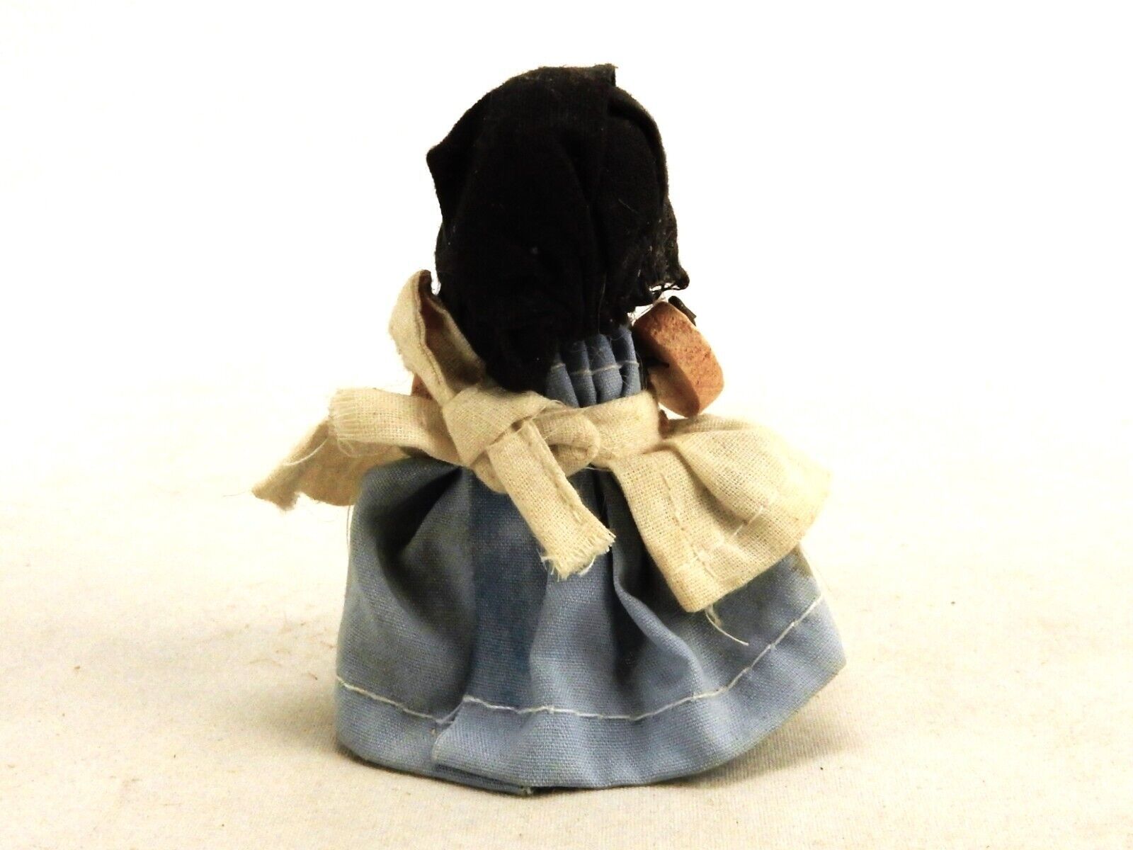Girl doll figure measures 2 3/4" tall x 1 1/2" wide x 1" front to back. She is a wooden block girl blue dress, black bonnet and abstract face. Her crescent cutout arms are pinned and move up and down. Her wood block legs are also pinned and move back and forth. Her clothing is in good condition but does need cleaned.