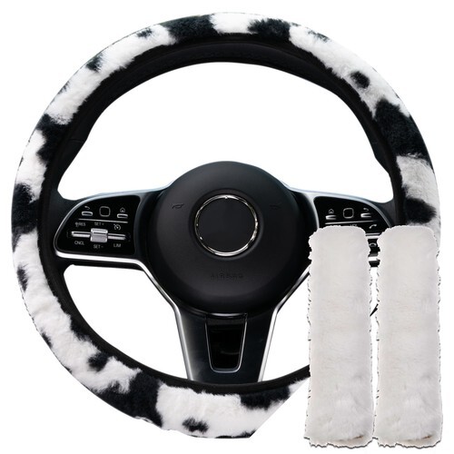 The steering wheel cover is a velvet type material in cow print.