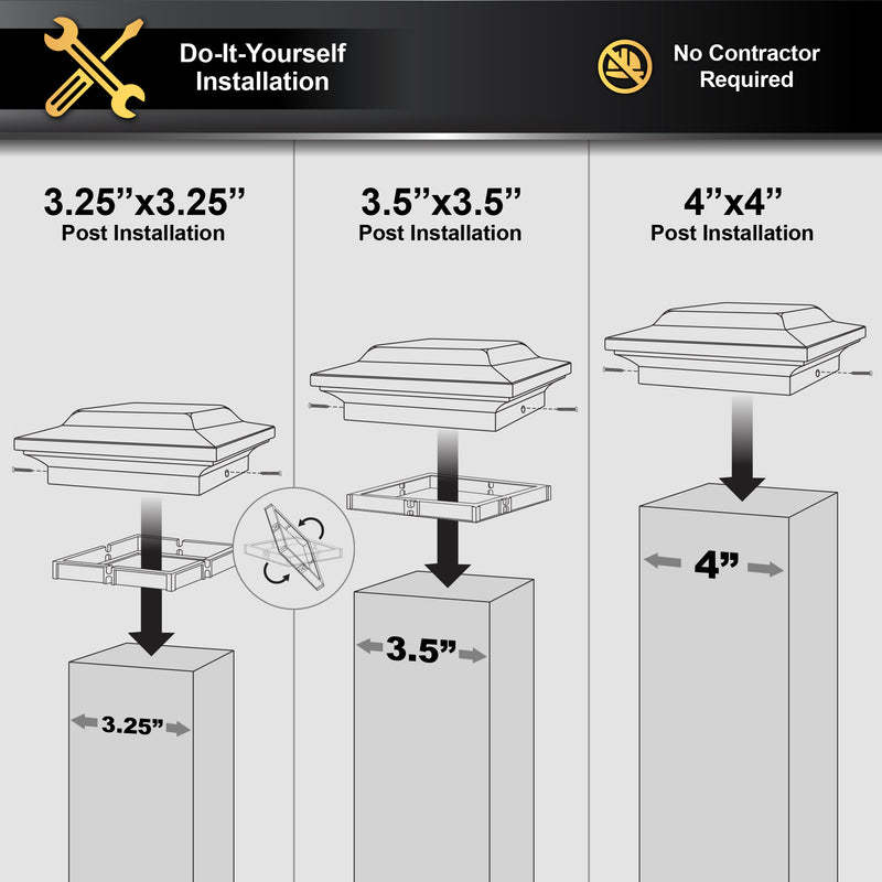 Will fit over an actual 4”x4”, 3.5”x3.5”, or 3.25”x3.25” post