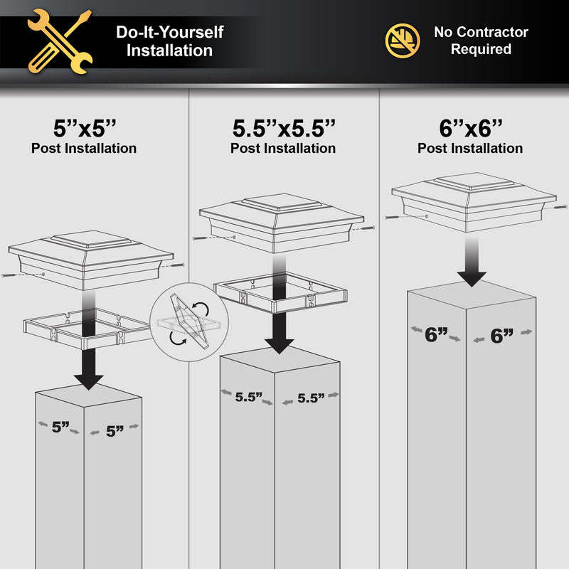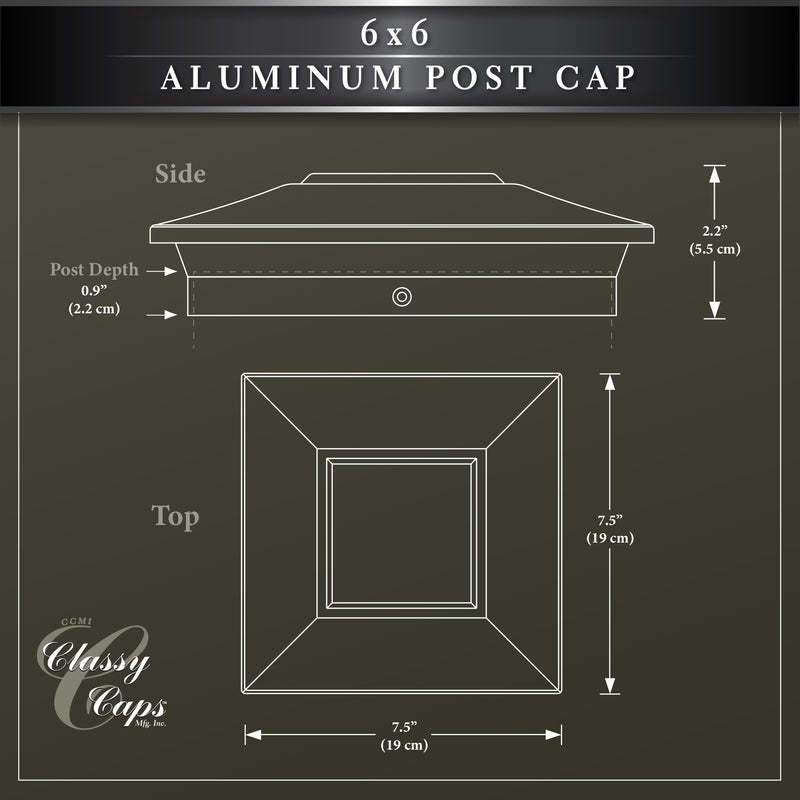 Classy Caps 6x6 Aluminum Post Cap Crafted from heavy-duty cast aluminum, this versatile post cap is designed to fit three standard post sizes: 6"x6", 5.5"x5.5", and 5"x5". Its robust construction ensures long-lasting performance, while the sleek, modern design adds a touch of sophistication. Perfect for enhancing the appearance of your fence, deck, or posts, the Classy Caps 6x6 Aluminum Post Cap not only protects your posts from weathering and decay but also elevates your exterior decor. Easy to install and maintenance-free, this post cap is the ideal finishing touch for any project.