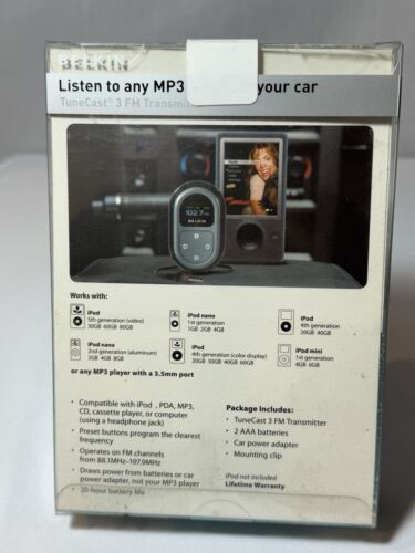 Perfect for collectors, audio enthusiasts, or anyone who appreciates the charm of retro devices, the Belkin TuneCast 3 FM Transmitter offers a rare opportunity to own a piece of mid-2000s innovation. Its sleek design, functionality, and collectible status make it a standout addition to any collection.