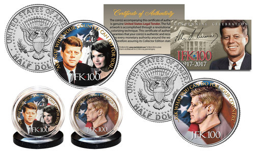Here is your chance to own, or give as a gift, a beautifully colorized JFK Kennedy Half Dollar U.S. Coin. Each coin comes in a premium coin capsule with a full color Certificate of Authenticity. As a bonus, you will also receive a special customizable Gift Message Card, if you decide to give this coin away as a gift. This official high-quality genuine Legal Tender United States Coin has been colorized using a unique multicolor authentic process. Colorizing coins involves the unique application of special inks directly to the surface of a coin using a unique and painstakingly multicolor coin process, that achieves a level of detail, color saturation, and durability that is #1 in the industry. The result is an everlasting colorized coin collectible of ultra-high quality.