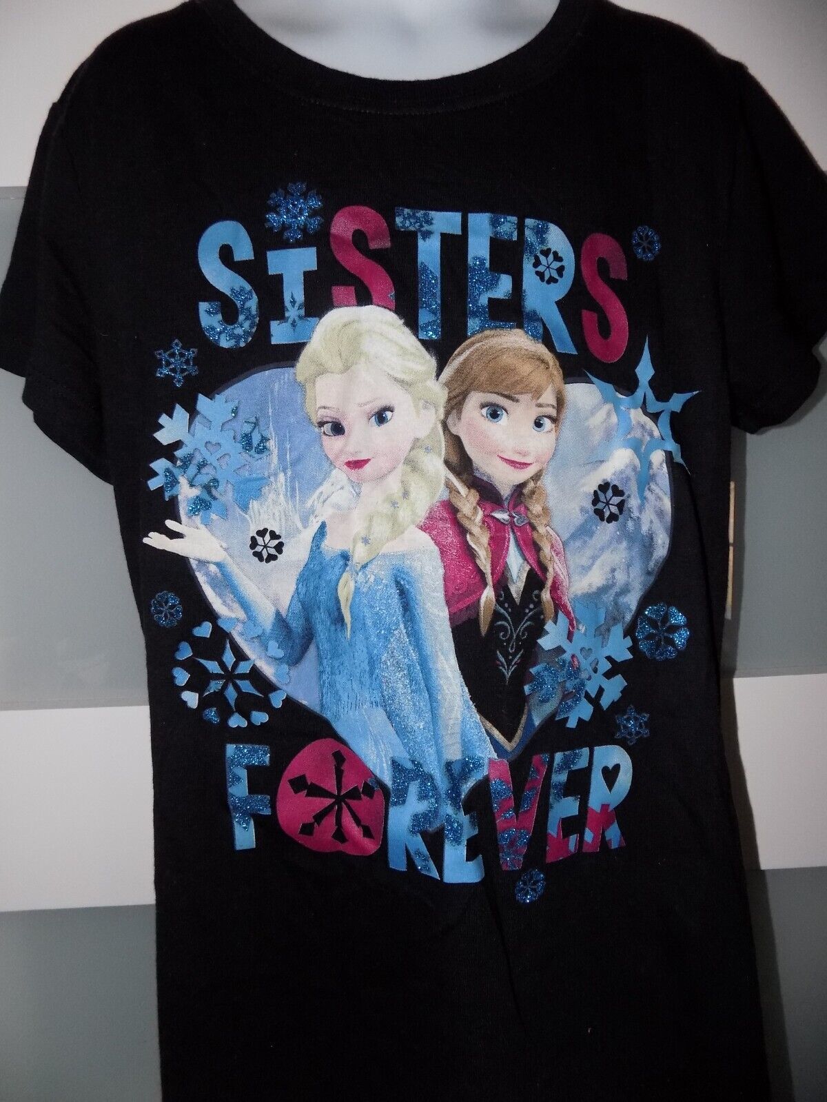Disney Frozen Elsa & Anna Sisters Forever Black Tshirt Size L (10/12) Girl's NEW