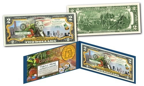 See the U.S.A. as never before with the All-New U.S. $2 Statehood Bills Currency Collection, a spectacular presentation. This all-new collection of Statehood $2 Bills honors each of our 50 states, and comes packaged in a premium display folio that shows both your States bill and the highly customized official States Certificate of Authenticity. You'll enjoy glimpses of each state's most fascinating sights, symbols, and stunning natural beauty; adding to the effect, the custom artwork also includes imagery inspired by the collector-favorite State Quarters and U.S. Parks. Discover breathtaking American beauties with a rare currency collection that also honors our national parks with brilliant color. While $2 Bills are genuine U.S. legal tender, they make up fewer than 1% of all currency produced today, and these rarely-seen bills are coveted collector favorites. The reverse of each statehood bill features the famous depiction of the signing of the Declaration of Independence. Your bills arrive in crisp Uncirculated Condition. Celebrate these magnificent works of art of America's history.