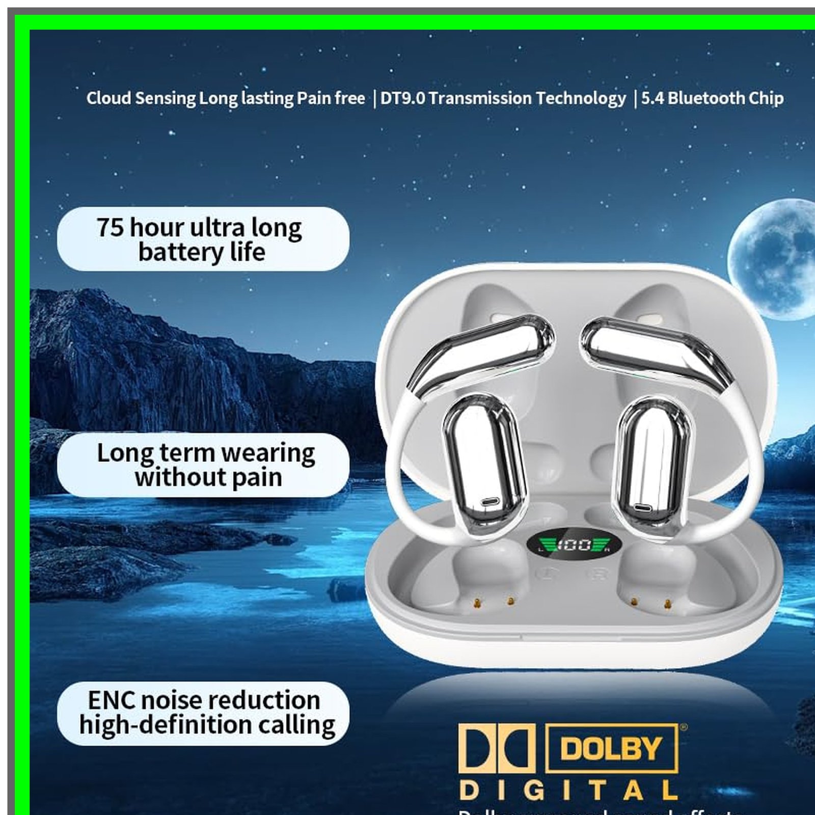 Revolutionary Open Design: Immerse in music while staying aware of your surroundings with an ergonomic design that combines exceptional audio quality and environmental awareness. Enhanced Bluetooth 5.4 Connectivity: Experience lightning-fast pairing and stable audio transmission with minimal latency, setting a new standard in wireless performance. Extended Playtime Convenient Display: Enjoy up to 80 hours of standby and 10 hours of continuous play on a single charge, with an LED digital display for easy battery monitoring. Crystal Clear Calls Wide Compatibility: Advanced dual microphones ensure exceptional call clarity in any environment, compatible with various devices for seamless communication. Lightweight Secure Fit: Crafted from premium soft silicone, these earbuds offer a comfortable, gravity-balanced design for a secure fit, allowing for worry-free listening during extended wear.