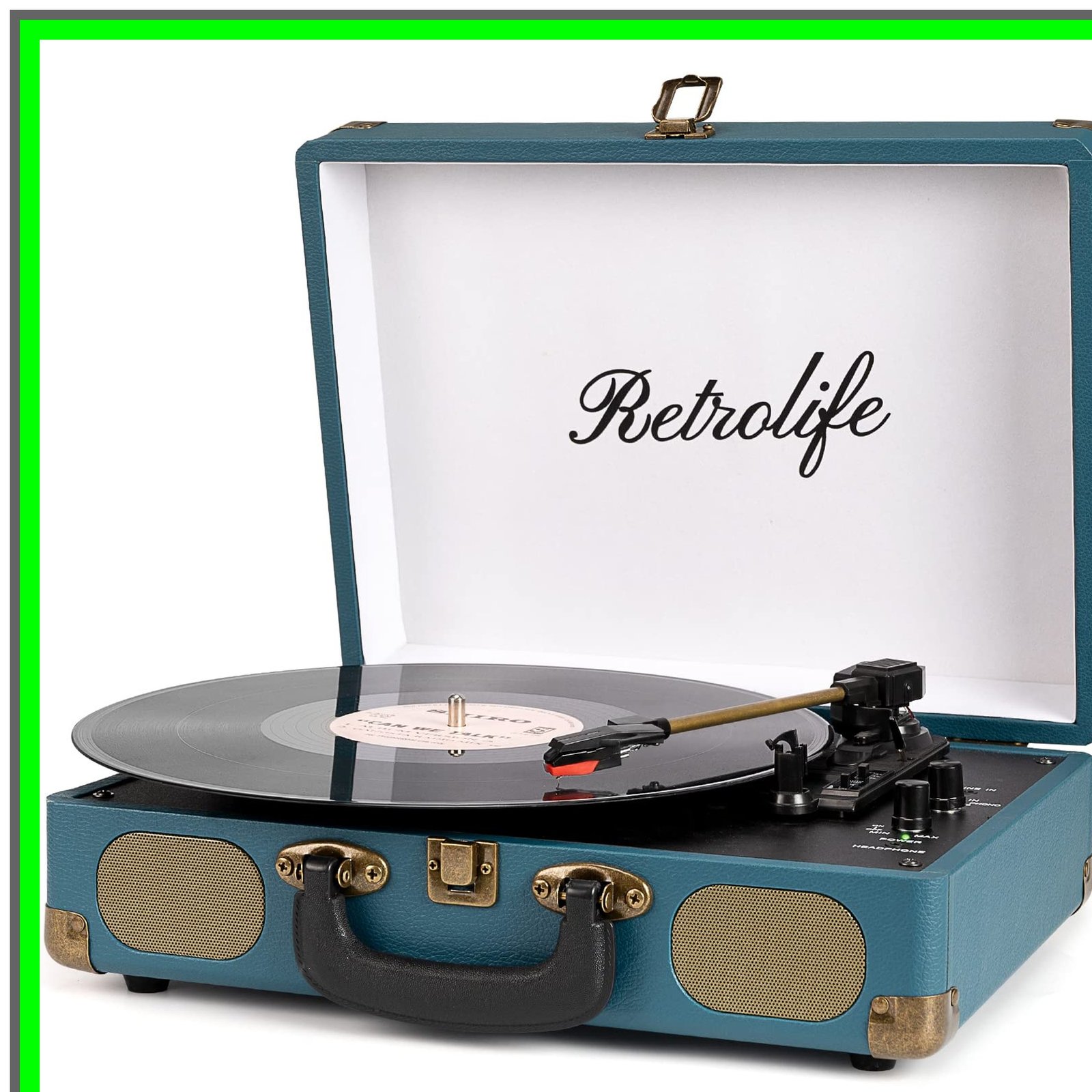 Experience the perfect blend of modern convenience and vintage charm with this individual suitcase record player. Its sleek black PU leather exterior, accented with retro bronze metal screws and nets, makes it a stylish addition to any setting. Designed for portability, it features a sturdy handle, allowing you to take your music memories wherever you go.Enjoy versatile connectivity options with built-in Bluetooth speakers for seamless music streaming. For non-Bluetooth devices, easily connect via RCA output or Aux-in line. Private listening is also possible with headphone compatibility, ensuring you can enjoy your favorite tunes anytime.This record player supports three sizes of records (7", 10", and 12") and offers three playing speeds (33, 45, and 78 RPM). The belt-driven system, combined with an anti-resonance design, delivers superior sound quality, enhancing your listening experience.Setup is a breeze?no extra equipment is required, making it ideal for both beginners and vinyl enthusiasts. Its compact size and premium sound quality make it suitable for any space, whether in your bedroom, living room, or office.Additional features include an auto-stop switch that halts playback at the end of a record and a quick mode switch for easy toggling between Bluetooth, Aux-in, and Phono modes. Perfect for relaxation, parties, or gatherings, this record player is your gateway to enjoying music in style.