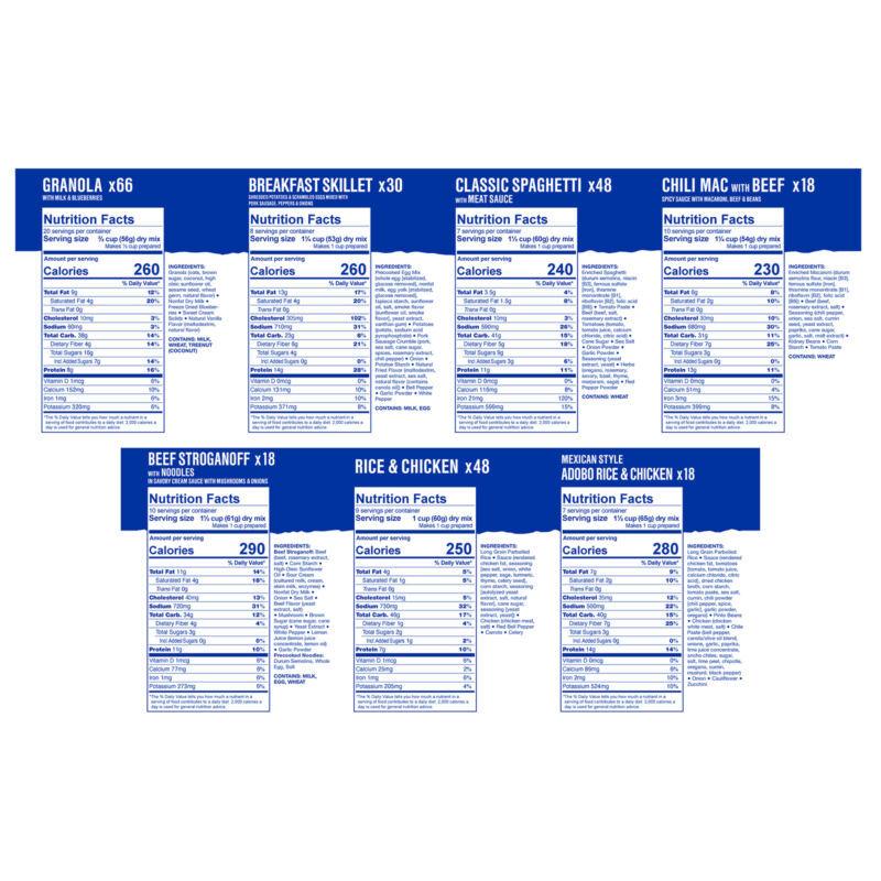 66 Mountain House Freeze-dried Granola with Milk and Blueberries #10 Cans 48 Mountain House Freeze-dried Rice and Chicken #10 Cans 48 Mountain House Freeze-dried Spaghetti with Meat Sauce #10 Cans 30 Mountain House Freeze-dried Breakfast Skillet #10 Cans 18 Mountain House Freeze-dried Mexican Adobo Rice and Chicken #10 Cans 18 Mountain House Freeze-dried Beef Stroganoff with Noodles #10 Cans 18 Mountain House Freeze-dried Chili Mac with Beef #10 Cans Up to 30 years shelf life Made in the USA