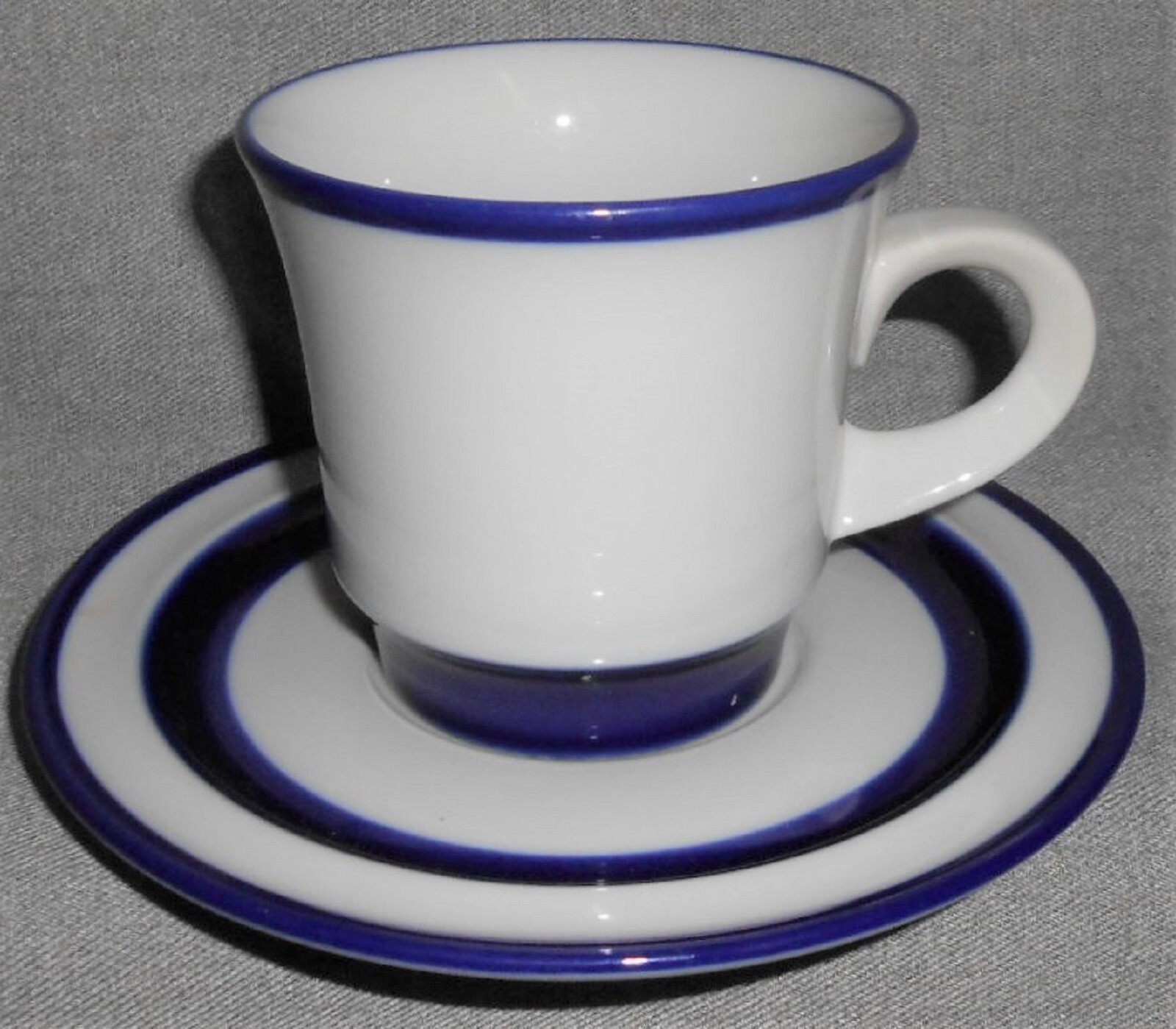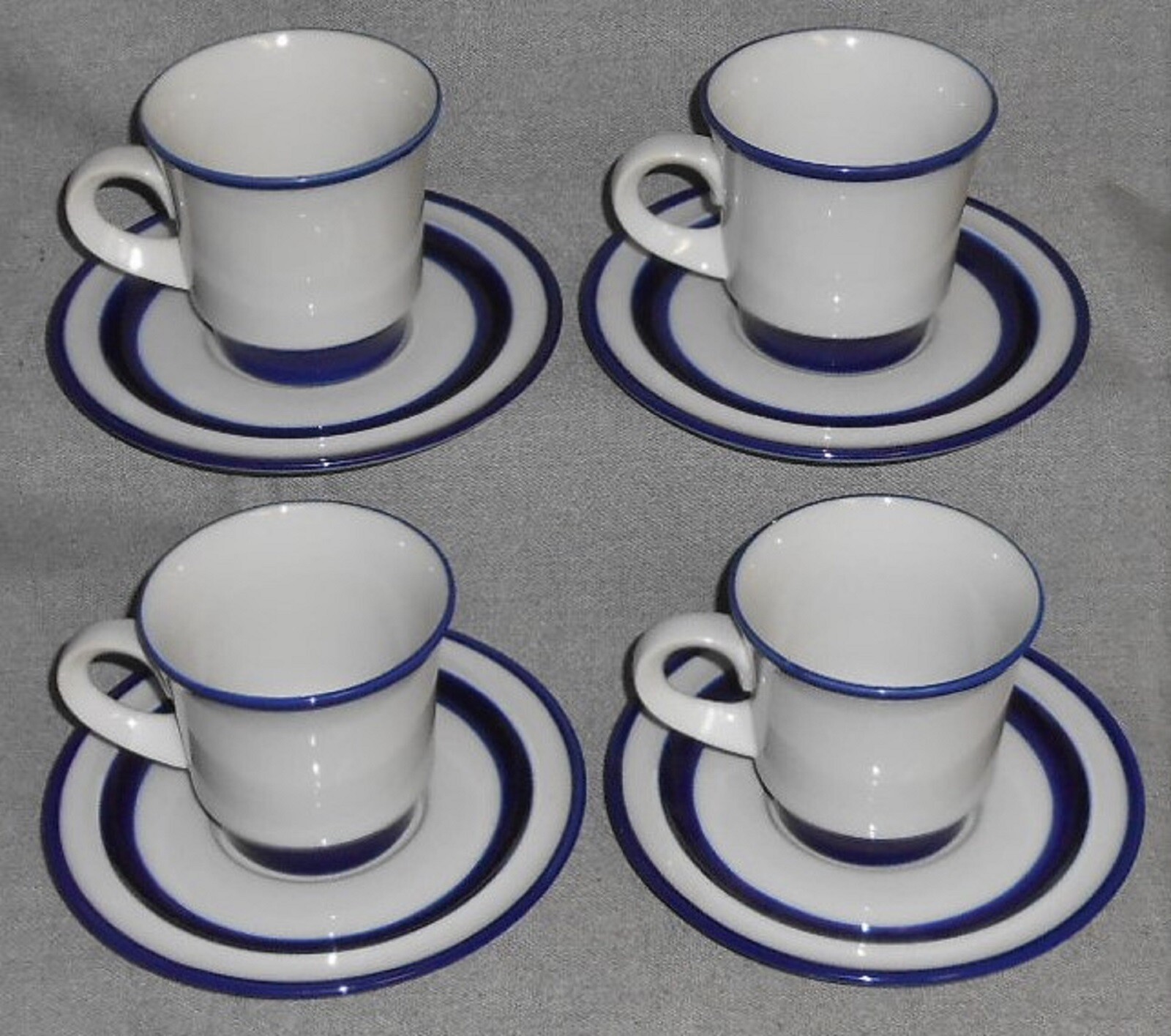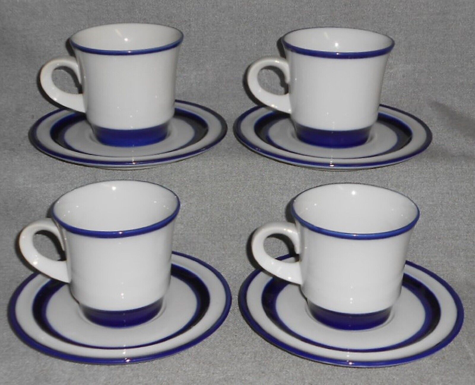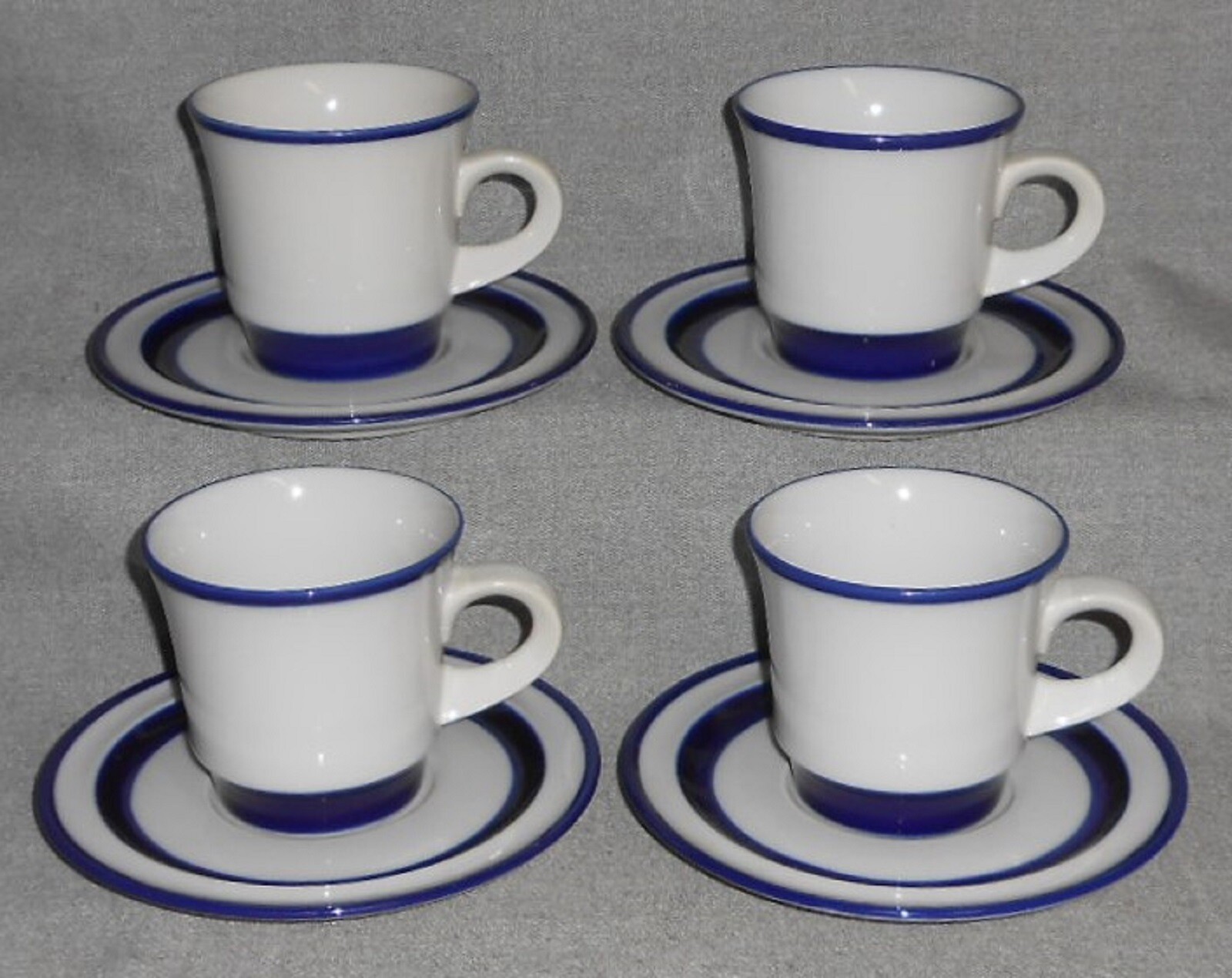 This is a set of (4) 3 1/4" Tall Cups and (4) 6 1/8" Saucers from Noritake Primastone in the Fjord Pattern. All eight pieces are in good pre-owned condition with no chips or cracks - great shade of cobalt blue!
