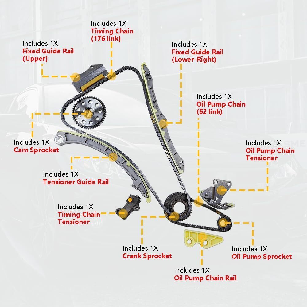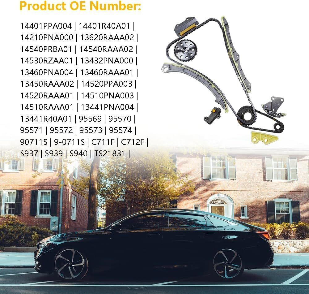 OE Number: 14401PPA004 | 14401R40A01 | 14210PNA000 | 13620RAAA02 | 14540PRBA01 | 14540RAAA02 | 14530RZAA01 | 13432PNA000 | 13460PNA004 | 13460RAAA01 | 13450RAAA02 | 14520PPA003 | 14520RAAA01 | 14510PNA003 | 14510RAAA01 | 13441PNA004 | 13441R40A01 | 95569 | 95570 | 95571 | 95572 | 95573 | 95574 | 90711S | 9-0711S | C711F | C712F | S937 | S939 | S940 | TS21831 | Package Includes: 1 X Timing Chain (176 link) | 1 X Timing Chain Tensioner | 1 X Fixed Guide Rail (Upper) | 1 X Fixed Guide Rail (Lower-Right) | 1 X Tensioner Guide Rail | 1 X Oil Pump Chain (62 link) | 1 X Oil Pump Chain Rail | 1 X Oil Pump Chain Tensioner | 1 X Cam Sprocket | 1 X Crank Sprocket | 1 X Oil Pump Sprocket | Compatible with 2003-2005 HONDA ACCORD 2.4L L4 ENG CODE "K24A4" | 2006-2007 HONDA ACCORD 2.4L L4 ENG CODE "K24A8" | 2002-2006 HONDA CR-V 2.4L L4 ENG CODE "K24A1" | 2007-2009 HONDA CR-V 2.4L L4 ENG CODE " K24Z1" | 2003-2006 HONDA ELEMENT 2.4L L4 ENG CODE "K24A4" | 2007-2011 HONDA ELEMENT 2.4L L4 ENG CODE "K24A8" |