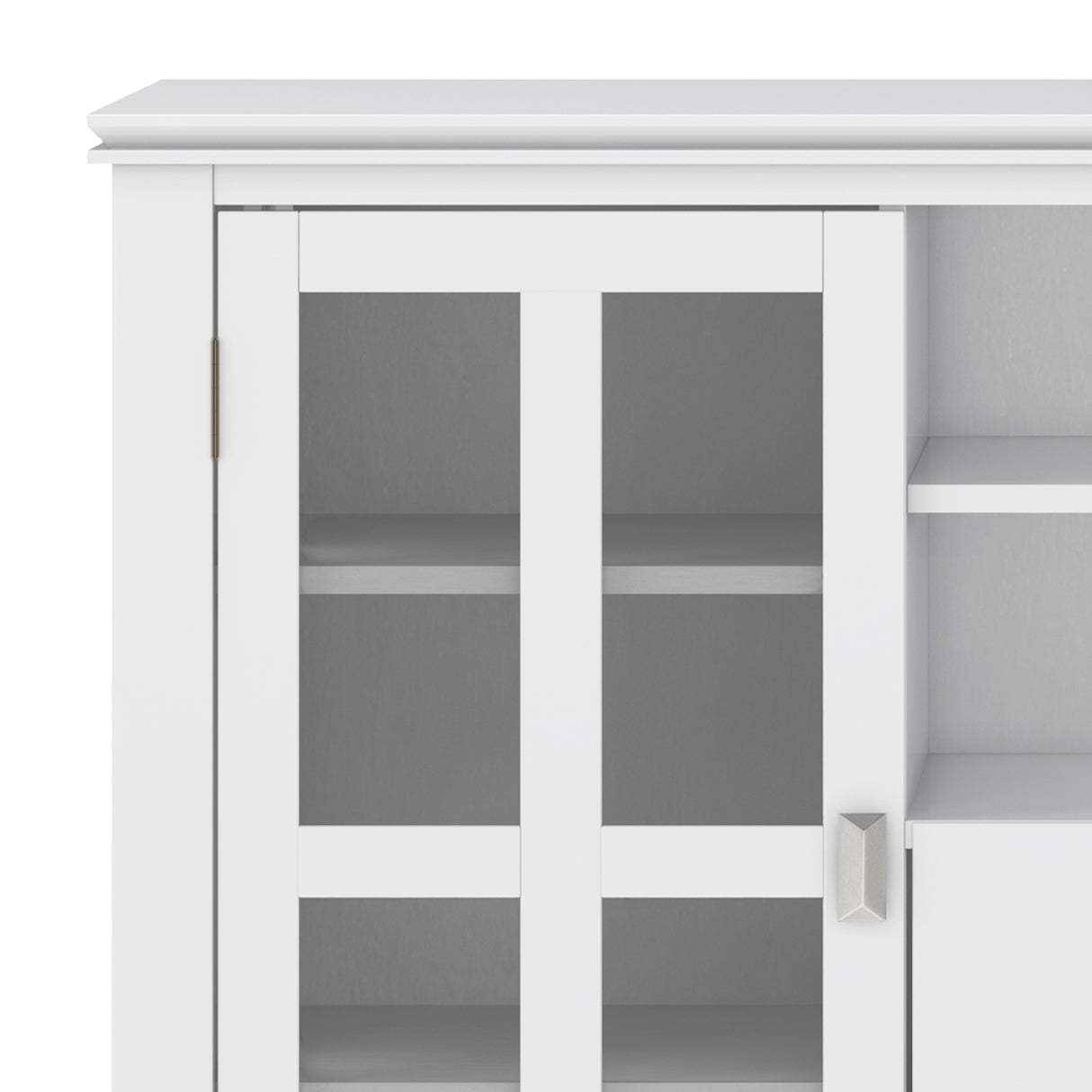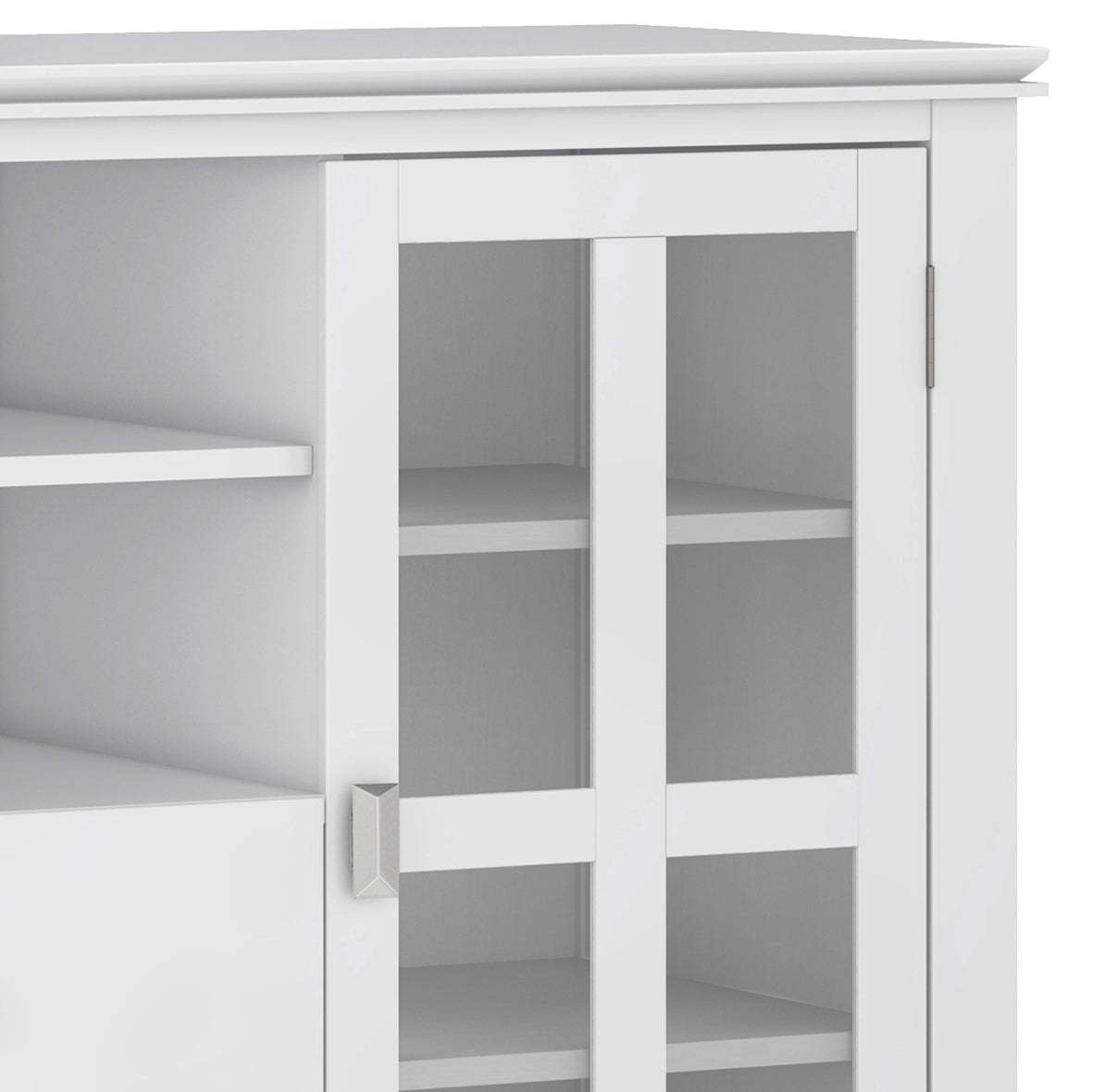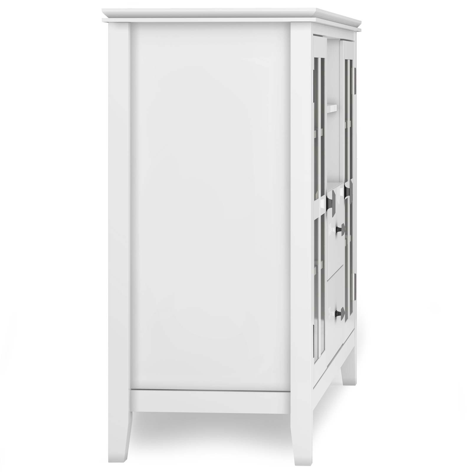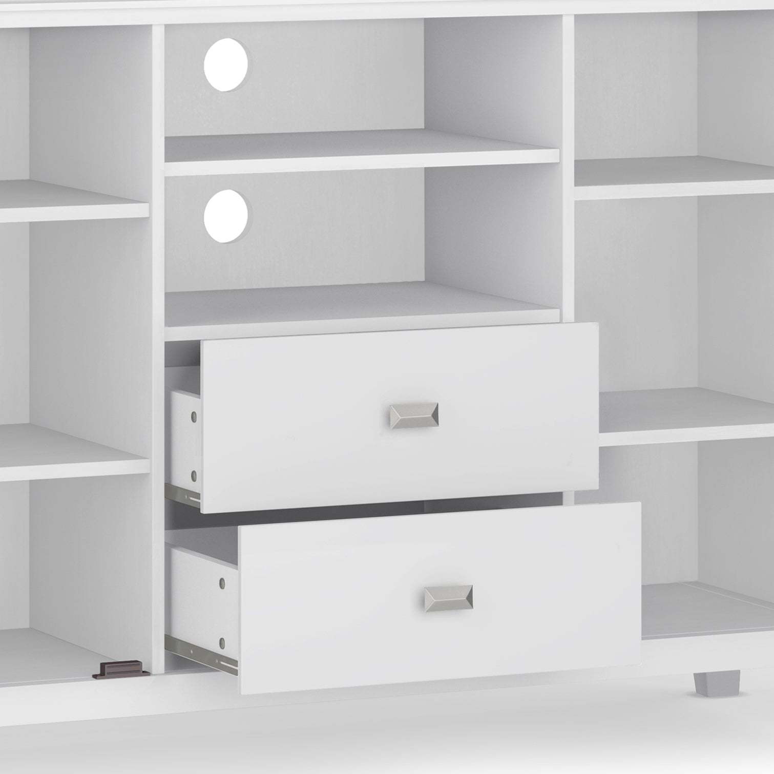 Features two (2) central drawers with metal glides, open center area with adjustable shelf and two (2) side tempered glass framed doors that open to large storage spaces with two (2) shelves each