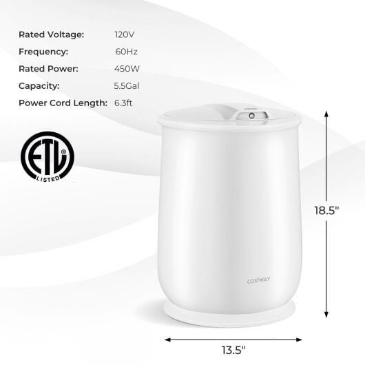 Specifications: Color White and Gray Material PP Galvanized Sheet PC Overall Dimension 13.5" x 13.5" x 18.5" (L x W x H) Capacity 5.5 Gallon Rated Voltage 120V AC Frequency 60Hz Wattage Max 450W Net Weight 7 lbs Length of Power Cord 6.3 ft 5 Minutes Heating 26646.4F 15 Minutes Heating 25741F 60 Minutes Heating 158F Box Qty 1(May vary by batch)