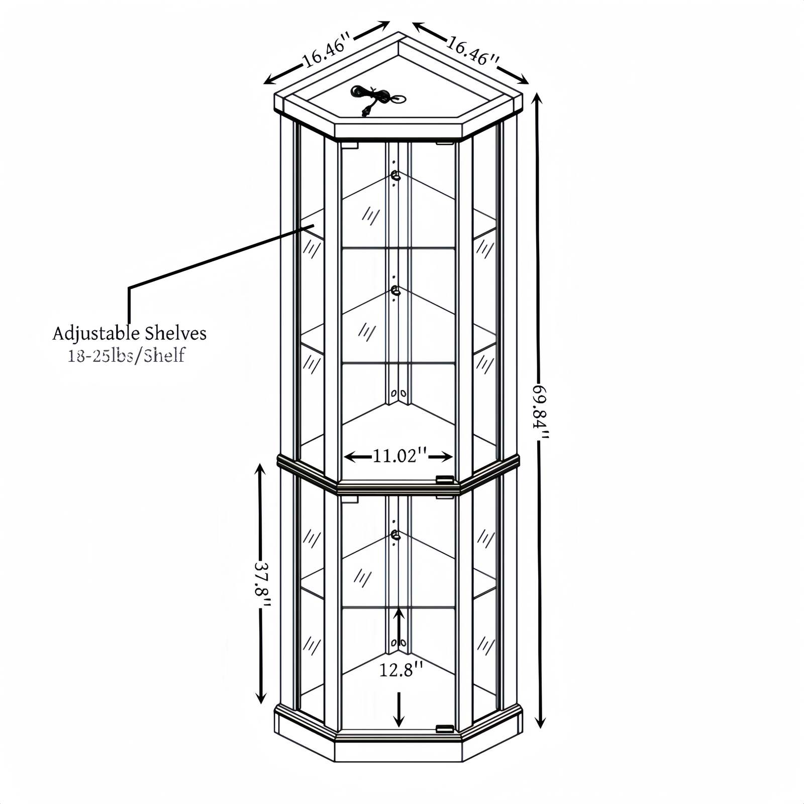Abundant and Exquisite Display Space: This elegant glass cabinet features two side-hung glass pane doors,divided into two sections. The adjustable shelves allow for personalized customization to showcase your items. Additionally, an included light adds a touch of sophistication and illuminates the displayed objects with radiant brilliance. The mirrored back panels further enhance the overall presentation, creating a truly magnificent showcase.