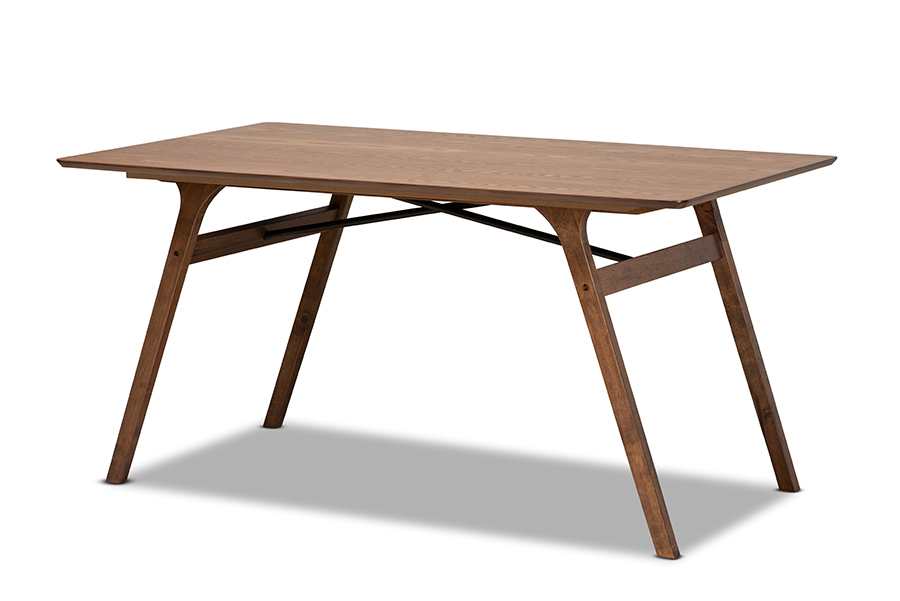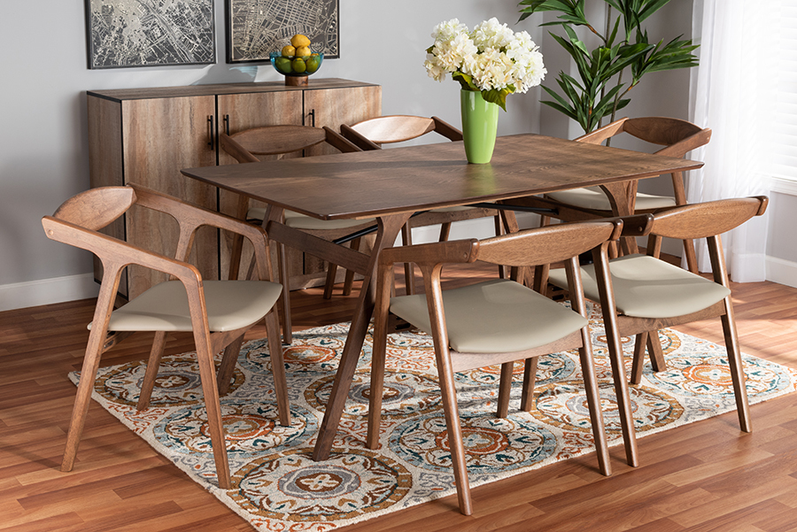 Bring retro-inspired design to your home with the stunning Beasley dining set. Made in Malaysia, the Beasley includes six dining chairs and one table crafted from walnut brown finished wood that projects visual warmth into any space. Each seat features a plush cushion padded with foam and upholstered in smooth faux leather for lavish comfort with every meal. Requiring assembly, the large, rectangular tabletop of the Beasley provides plenty of elbow room for each member at the table. Tasteful and comfortable, the Beasley dining set is sure to enhance any dining occasion.