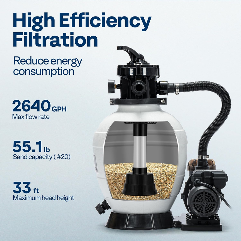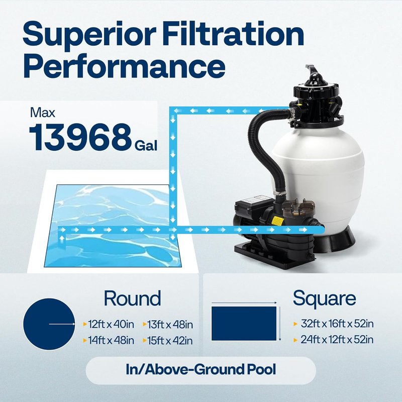 EFFICIENT AND ENERGY-SAVING: The VIVOHOME 13-in sand filter pump boasts a ??.? ?? ???? capacity, delivering a maximum flow rate of ???? ??? and a maximum head height of 33 ft; Designed to efficiently reduce energy consumption, this pump ensures optimal performance by precisely matching the power needs of most above-ground pools; It?s also perfect for in-ground pools ranging from 10476 Gallon (running 6 hours) to ????? ?????? (running 8 hours)