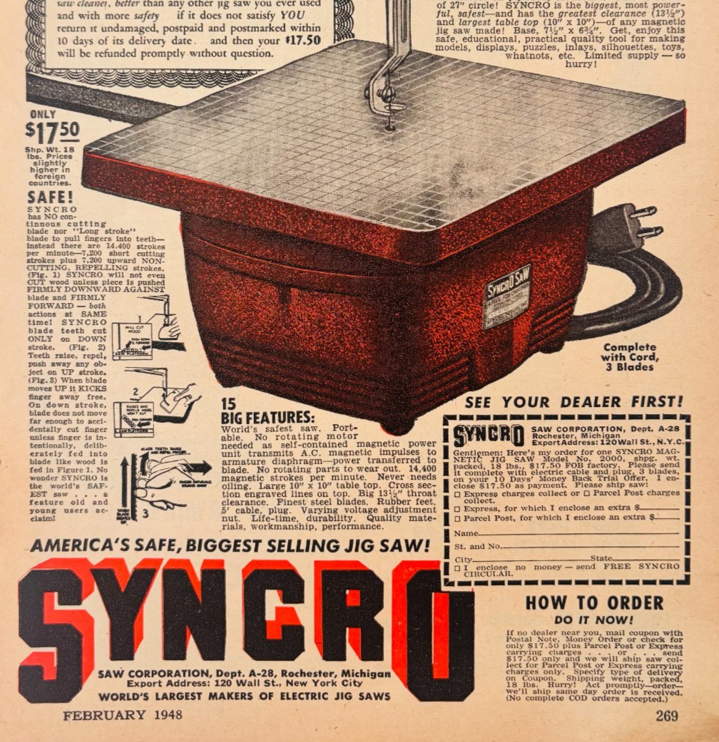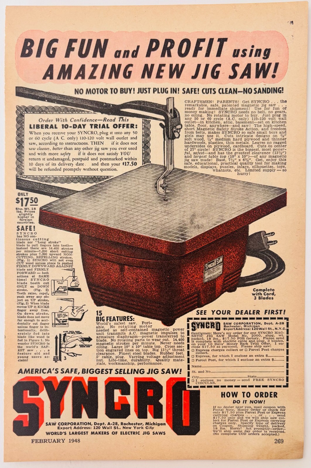 1948 Syncro Corporation Advertisement New Jig Saw Vintage Shop Tools F15V1