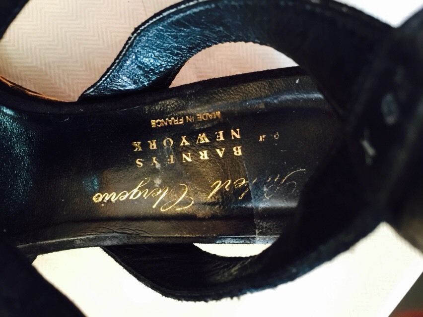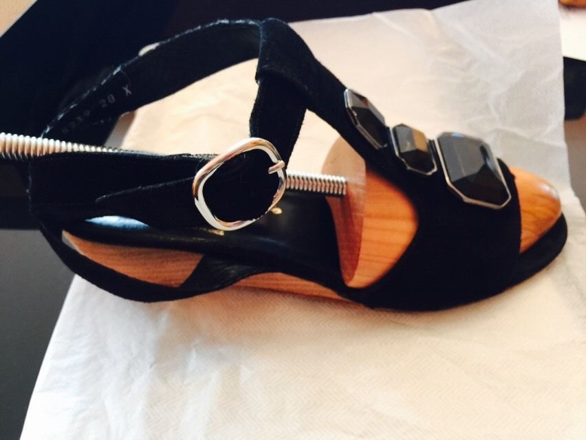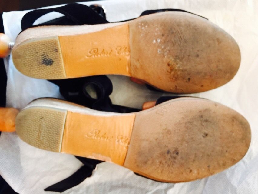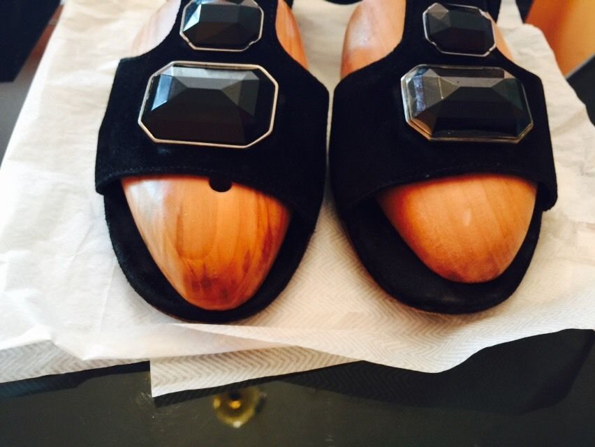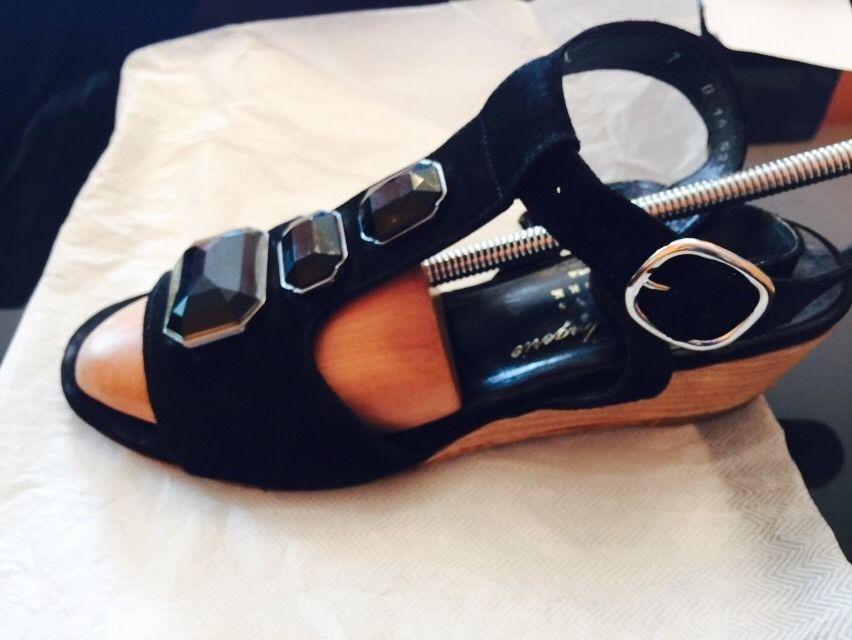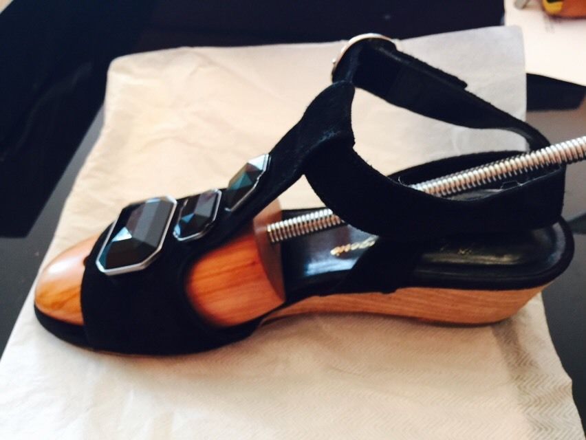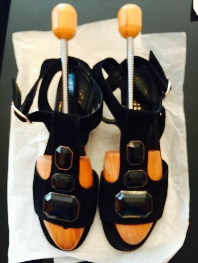 These pre-owned black suede with gem detail Robert Clergerie wedge sandals are in very good condition with only minor/normal signs of wear as they were only worn a handful of times by their previous owner. They feature: