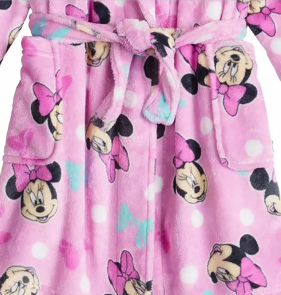 This cozy robe is made of ultra-soft, warm Minky fleece, both inside and out. It features a charming pink design with an adorable Minnie Mouse print, surrounded by bows and polka dots. The shawl-style collar provides extra warmth and comfort, and it comes with an attached coordinating front tie belt as well as front pockets. The fabric is made of 100% polyester.