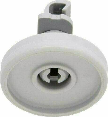 The Dishrack Wheel Assembly is a Whirlpool OEM Replacement Part designed to facilitate the smooth operation of the lower rack in your dishwasher. This white plastic roller measures less than two inches in diameter. It fits the lower dishrack and includes a wheel and axle. It is generally replaced when the dishwasher is making loud noises or if the lower rack is getting stuck during movement.
