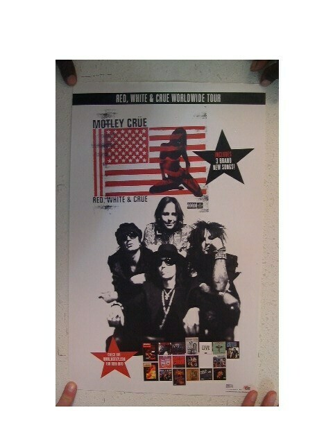 This poster is 11 by 17 inches approximately and is not in mint condition. It has minor edge dings and crinkles. It is for the album Red, White Crue. It is shipped rolled in a hard cardboard tube.