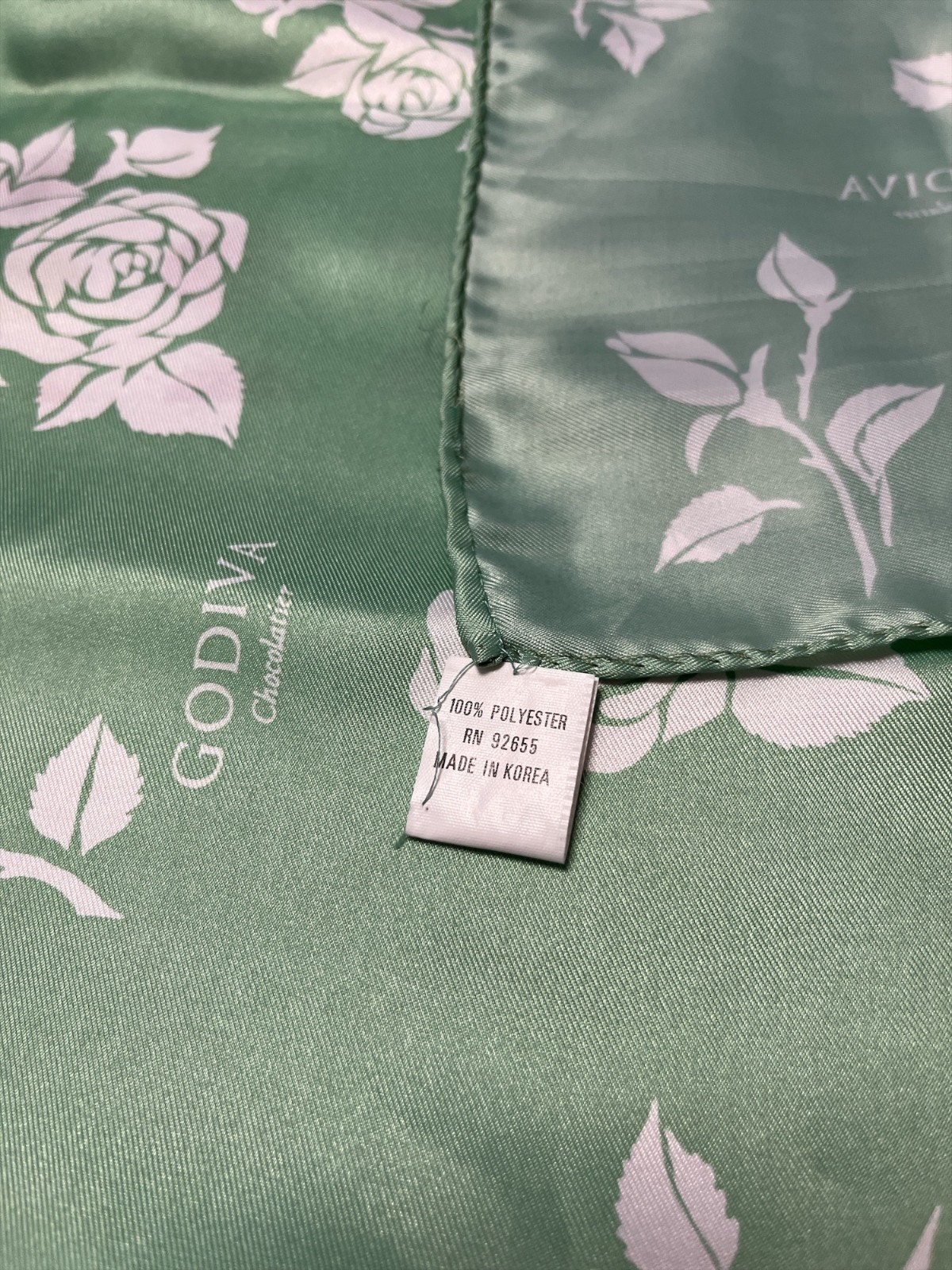 Vintage Godiva Chocolatier Green Rose Print Scarf ? 100% Polyester ? 34" Square ? Made in Korea