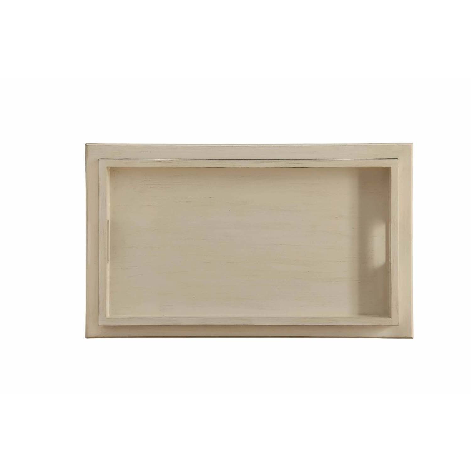 Features: Rectangular Tray Table Storage: Removable Tray, 1 Open Compartment (1 Fixed Shelf) French Style Wooden Top, Apron Tray Wooden Turned Leg with Metal Caster Wheel: Solid Wood (Without Lock) Set Includes: One (1) Serving Cart