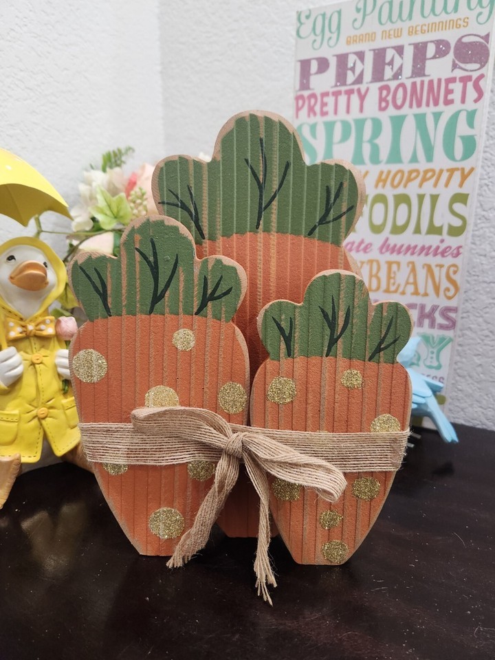Up for sale is this adorable sign for your Easter decor the sign has 3 carrots with gold glitter polka dots. You can either stand on a table top or hand on a wall. Sign is soooo cute!! Measures approx 8" wide x 11.75" tall. New.
