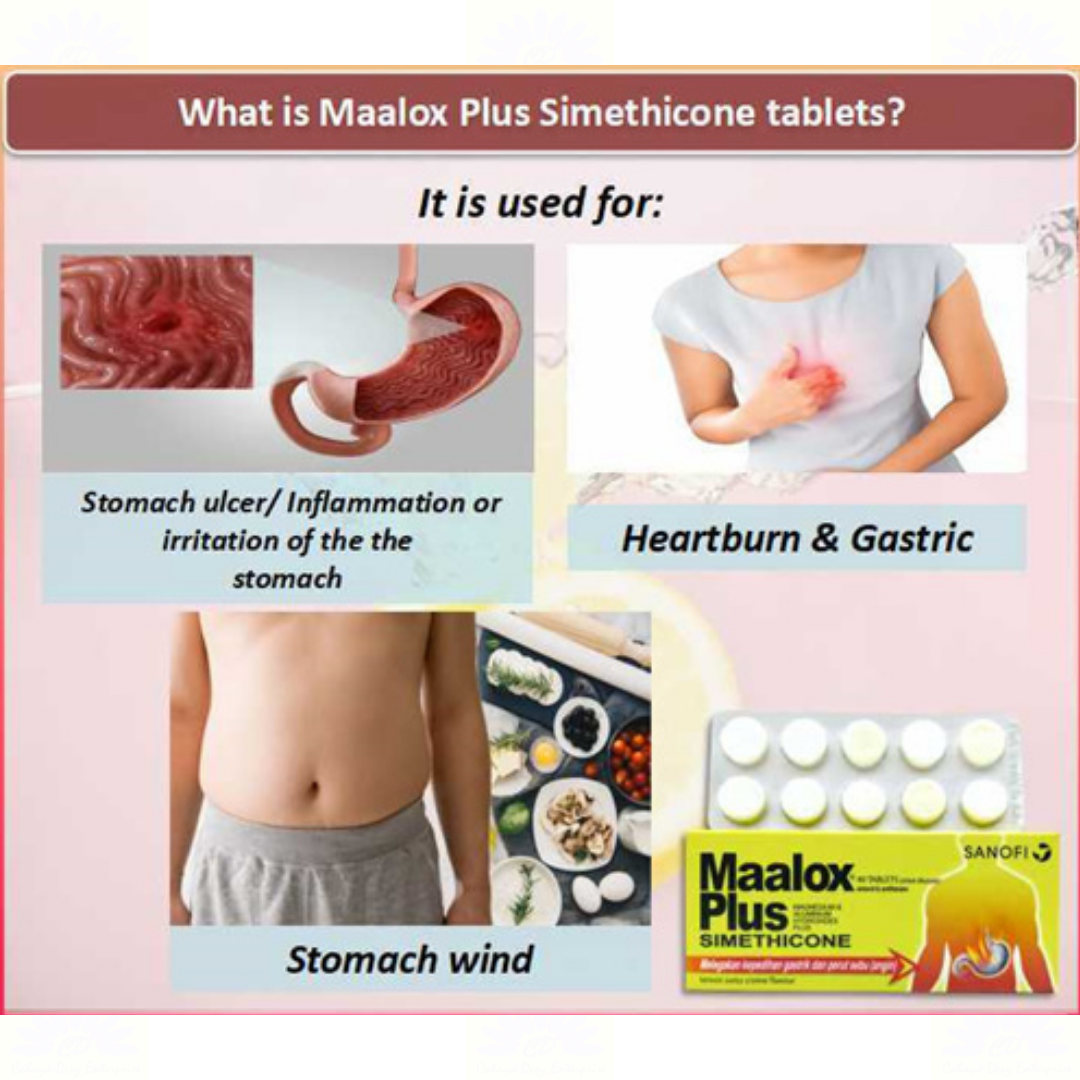 Maalox Plus Tablet vous donne un soulagement rapide et efficace des brûlures d'estomac, avec une activite durable. Maalox Plus aide egalement a soulager les flatulences et l'eolien provoques par l'exces de gaz. En effet, il contient de la simethicone, un ingredient supplementaire qui n'est pas dans le maalox «standard». Maalox plus soulage les brûlures d'estomac (indigestion acide) en neutralisant l'acide en exces dans l'?sophage (pipe alimentaire) et l'estomac. Vous devriez commencer a ressentir un soulagement des brûlures d'estomac tres rapidement.
