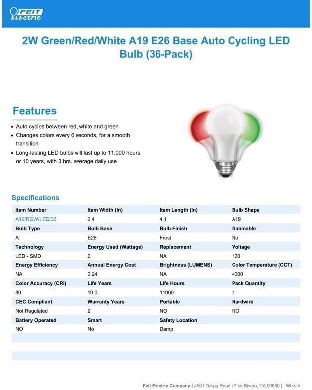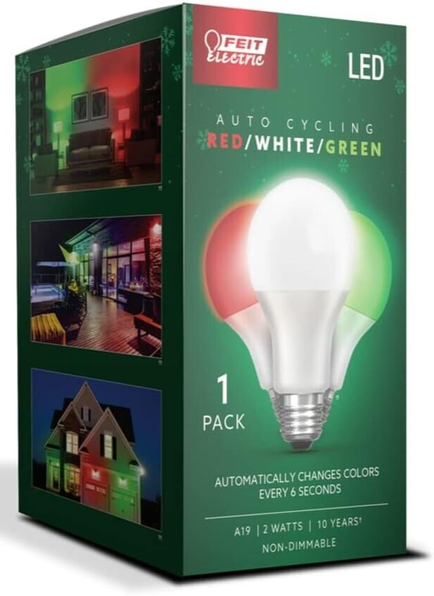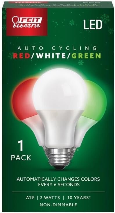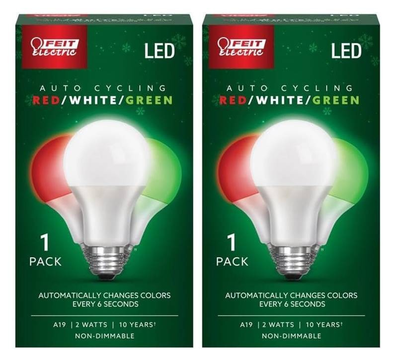 LED Lamp Bulb A19 E26(M) 2W Auto-Cycling Green/Red/White - FEIT ELECTRIC A19/RGW/LED/36 (2-PACK)