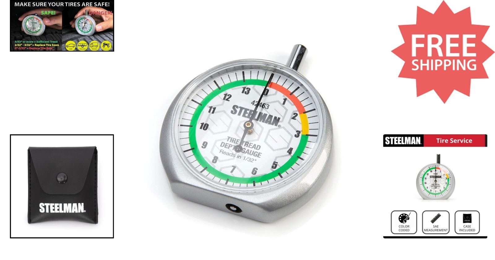 Ensure your vehicle's safety with the STEELMAN Dial-Type Color-Coded Tread Depth Gauge. Compact and durable, it features a powder-coated zinc alloy casing measuring just 2.38 x 2.09 x 0.73 inches for easy handling and storage. The color-coded face (green/yellow/red) provides quick visual indicators of tire tread health?green for safe, yellow for worn, and red for replacement needed. Precision markings in 1/32-inch increments, along with detailed 1/128-inch gradations, allow for accurate assessments from 0 to 14/32-inch. Its springless design is ideal for deep-set wheels on sports cars, trucks, and larger vehicles. Comes with a protective PVC pouch for convenience. Trusted by professionals, STEELMAN combines innovative design with high-quality materials to keep your tires in optimal condition. To ensure fast and reliable delivery, we work with multiple fulfillment partners and suppliers. Depending on availability and location, your order may ship from different warehouses or arrive in packaging that varies from item to item. Tracking details are typically provided shortly after shipment, and customer satisfaction remains our top priority. Please note that due to carrier policies and regional regulations, certain items may not be eligible for delivery to specific states or territories.