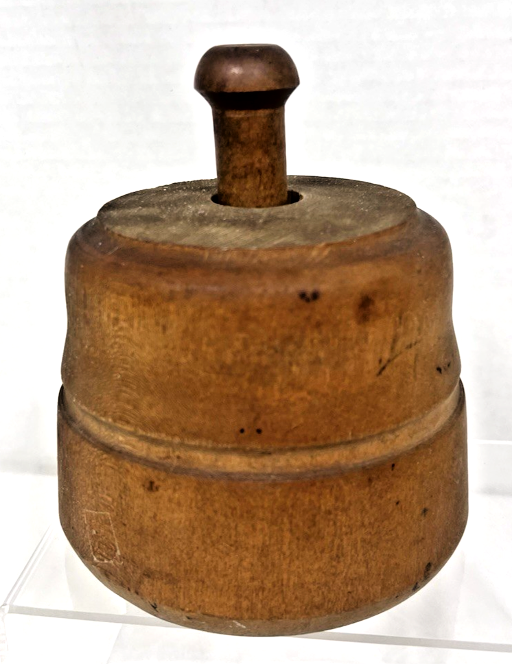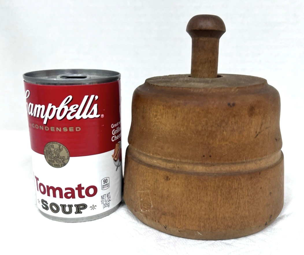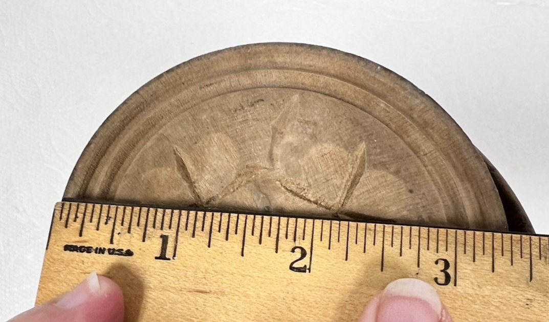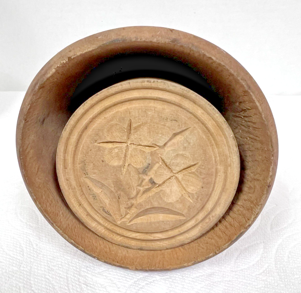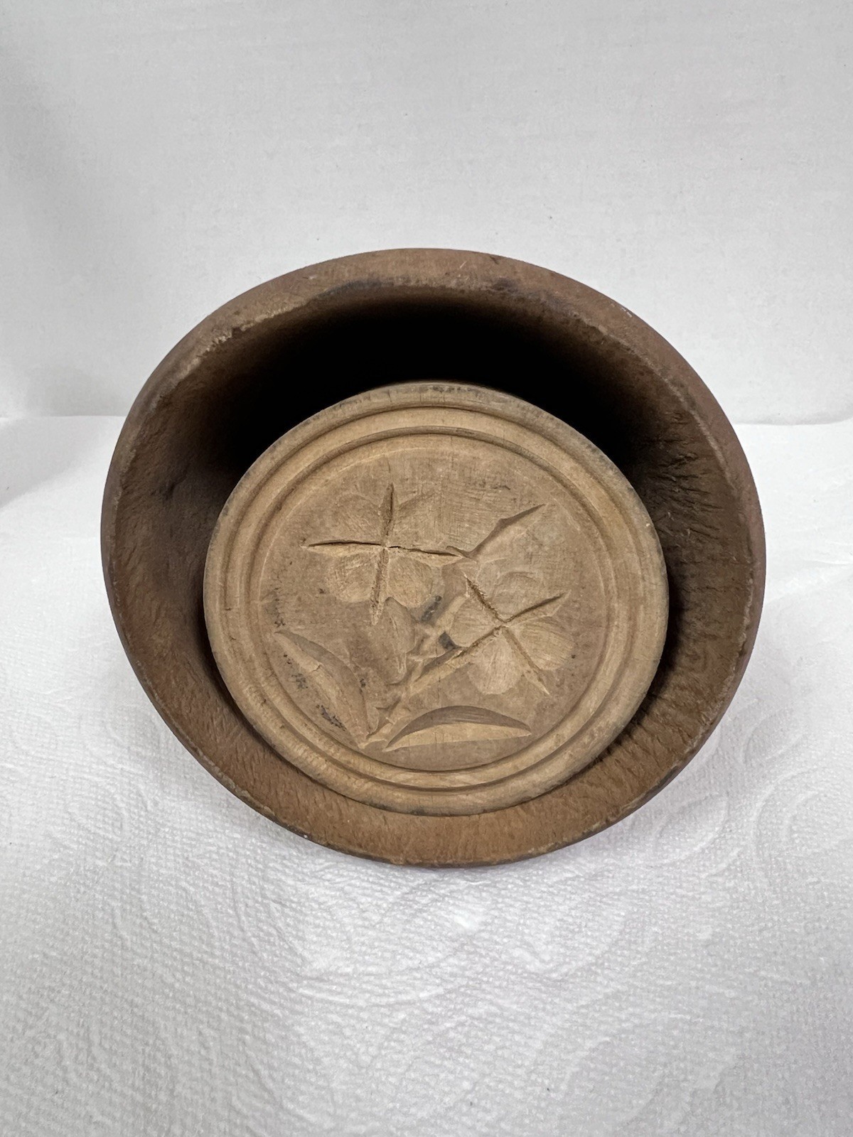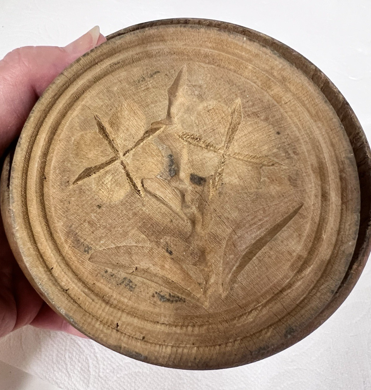 Vintage Butter Or Cookie Press Floral Plant Carved Wood 3 1/2" Wide across the press part the outer part is just shy of 5 inches and it stands about 5 3/4 inches tall