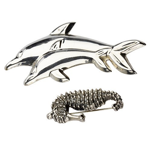 Creatures de mer en argent sterling deux broches, chevaux de mer, mere et fils Dolphins METAL: Argent sterling Mesures du 1er article: 1 5/8 "H x 3/4" W. Caracteristiques du 1er article: Une broche d'hippocampe d'argent. 2e mesures d'element: 1 3/8 "H x 3 1/4 "W.