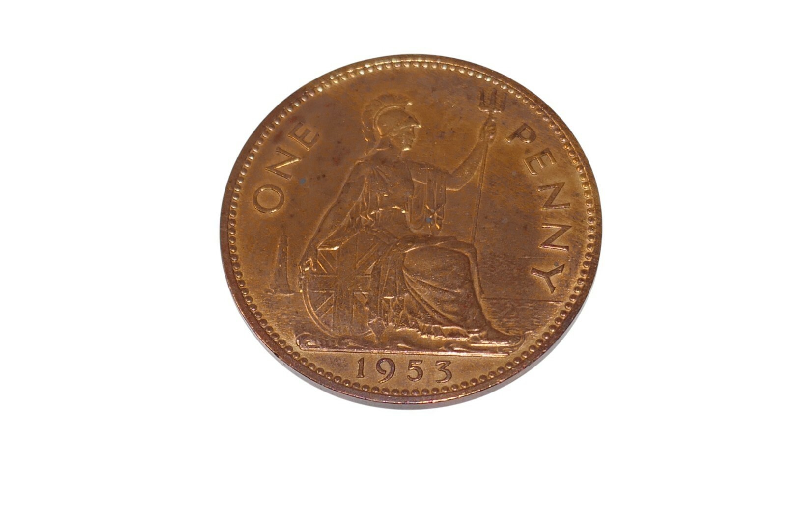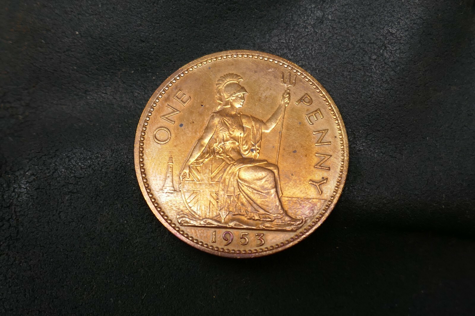 This is a United Kingdom 1953 Queen Elizabeth II One Penny bronze coin. This coin was minted in England by the United Kingdom and has a denomination of Penny. It is a piece of world coins from Europe, specifically from Great Britain.