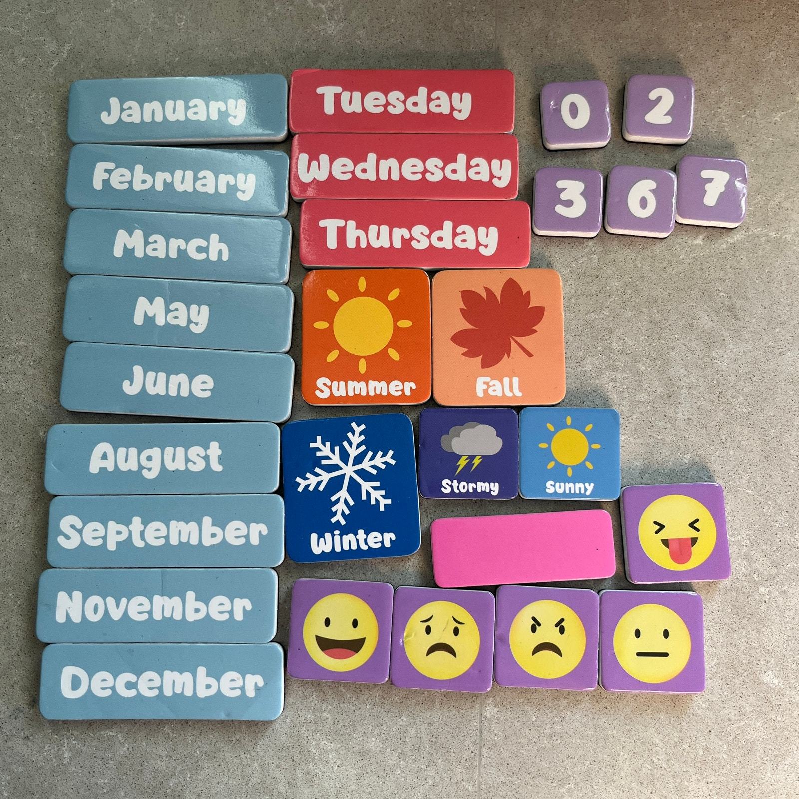 Magnetic Daily / Monthly Calendar Miscellaneous Replacement Pieces. Good condition. See pictures for what is included. Can be used with the Melissa Doug calendars. This is not a complete set.