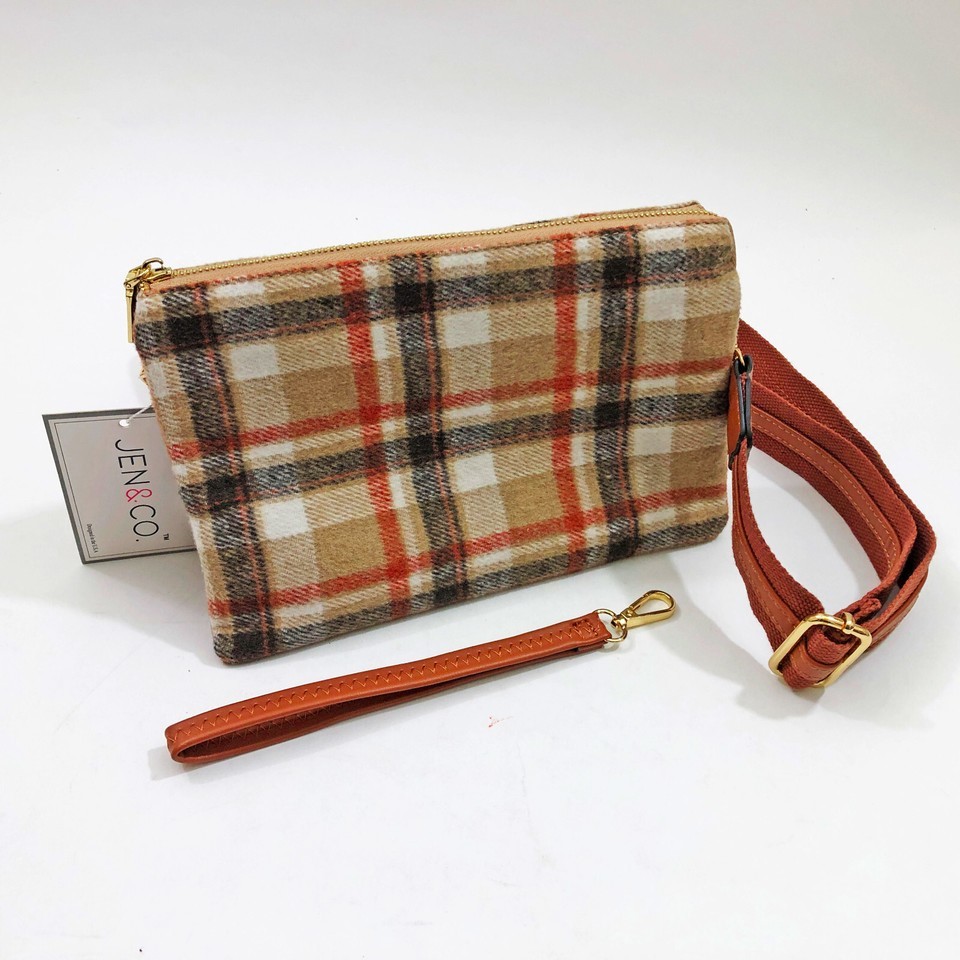 Jen Co. New with tags sales sample model Izzy plaid cross body or wristlet clutch bag. This model Izzy has beautiful fall colors of brown, rust, white, and tan. It's crafted from fabric and accented with vegan leather for a responsible, yet luxurious finish. This Izzy plaid crossbody isn't just a bag; it's a versatile companion ready to make a statement with any ensemble.