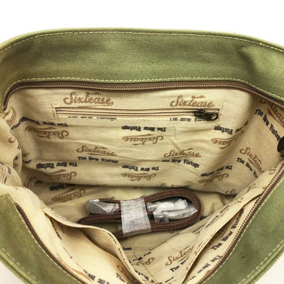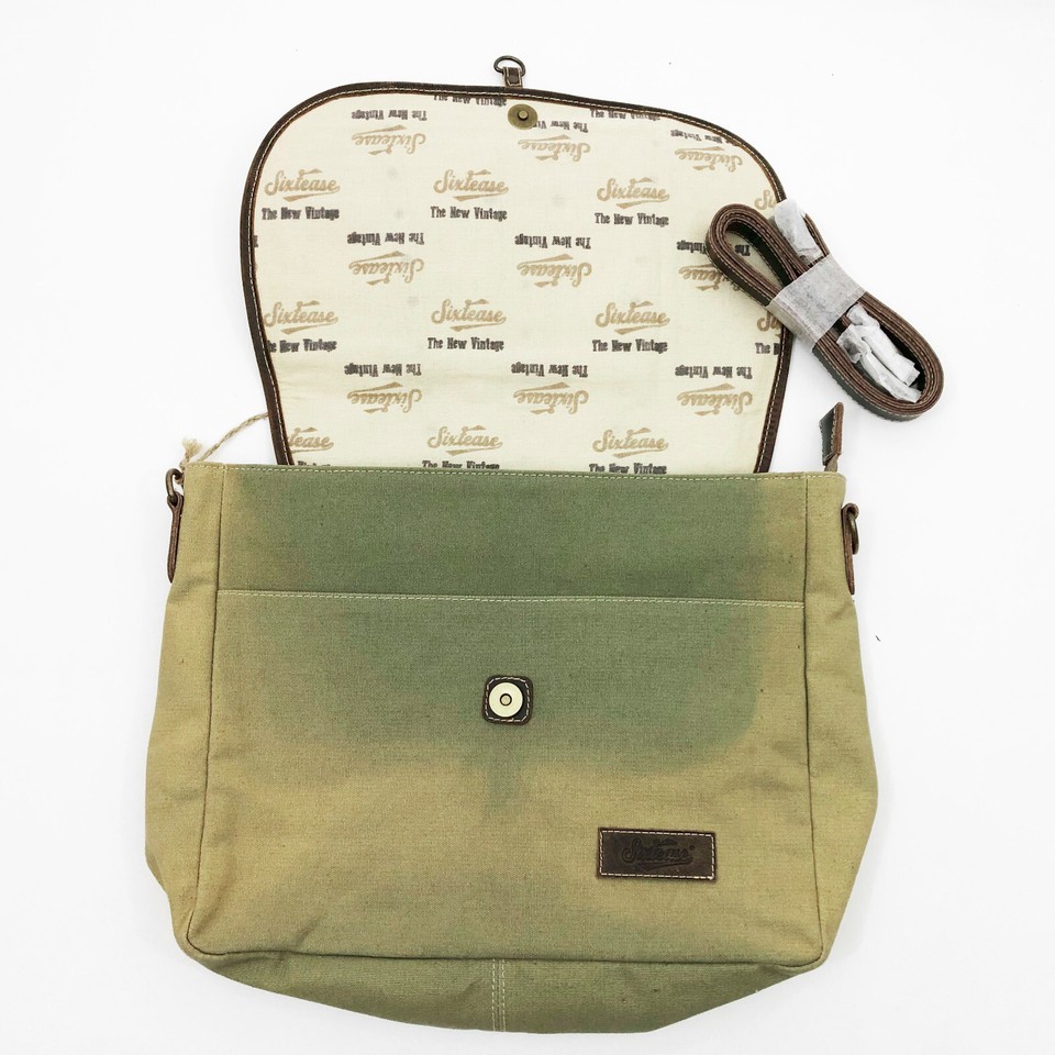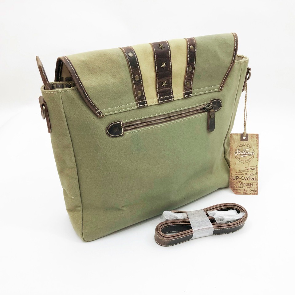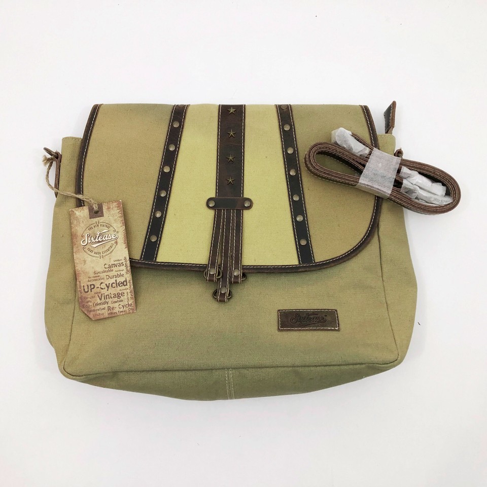 NWT, New With Tags. Sixtease cross body bag with adjustable leather strap is made of recycled military tent material and is handcrafted with the spirit of the New Vintage and Contemporary look.
