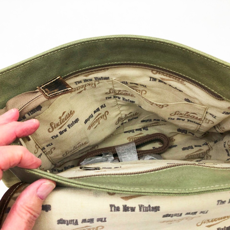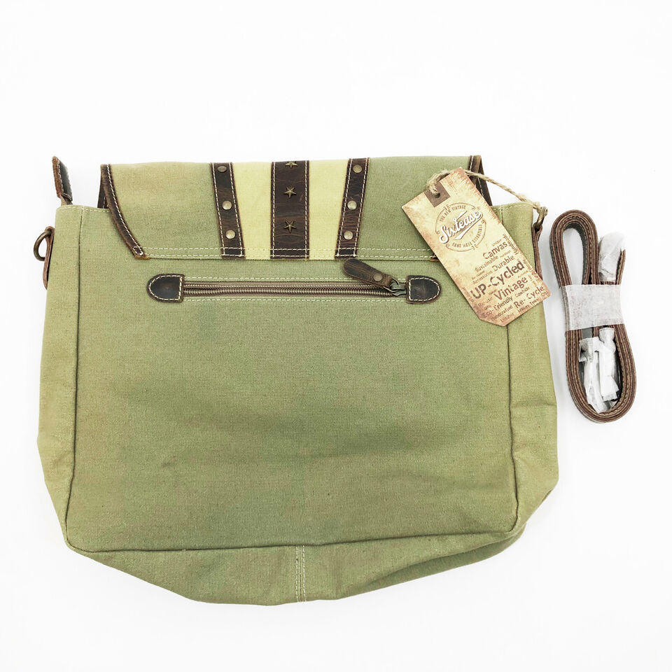 Flap front has decorative leather accents and antique finish hardware. Under the flap is one large slip pocket. Inside are 2 open slip pockets and 1 zipper pocket. On the back is a zipper close pocket. This bag has lots of room and has been handcrafted with recycled military tent material.