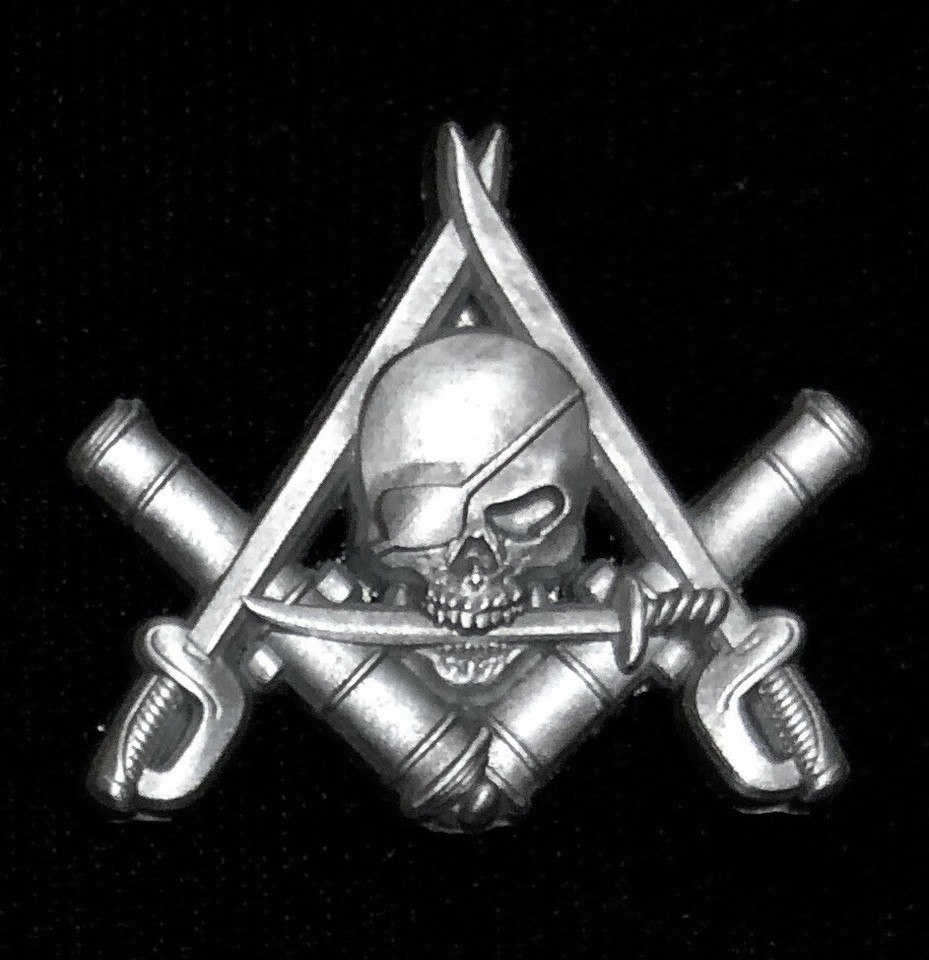 ?Cannons and Cutlasses? Masonic Freemason Pirate Pin in Antique Silver. Measures 1.25? tall. Double pinback.