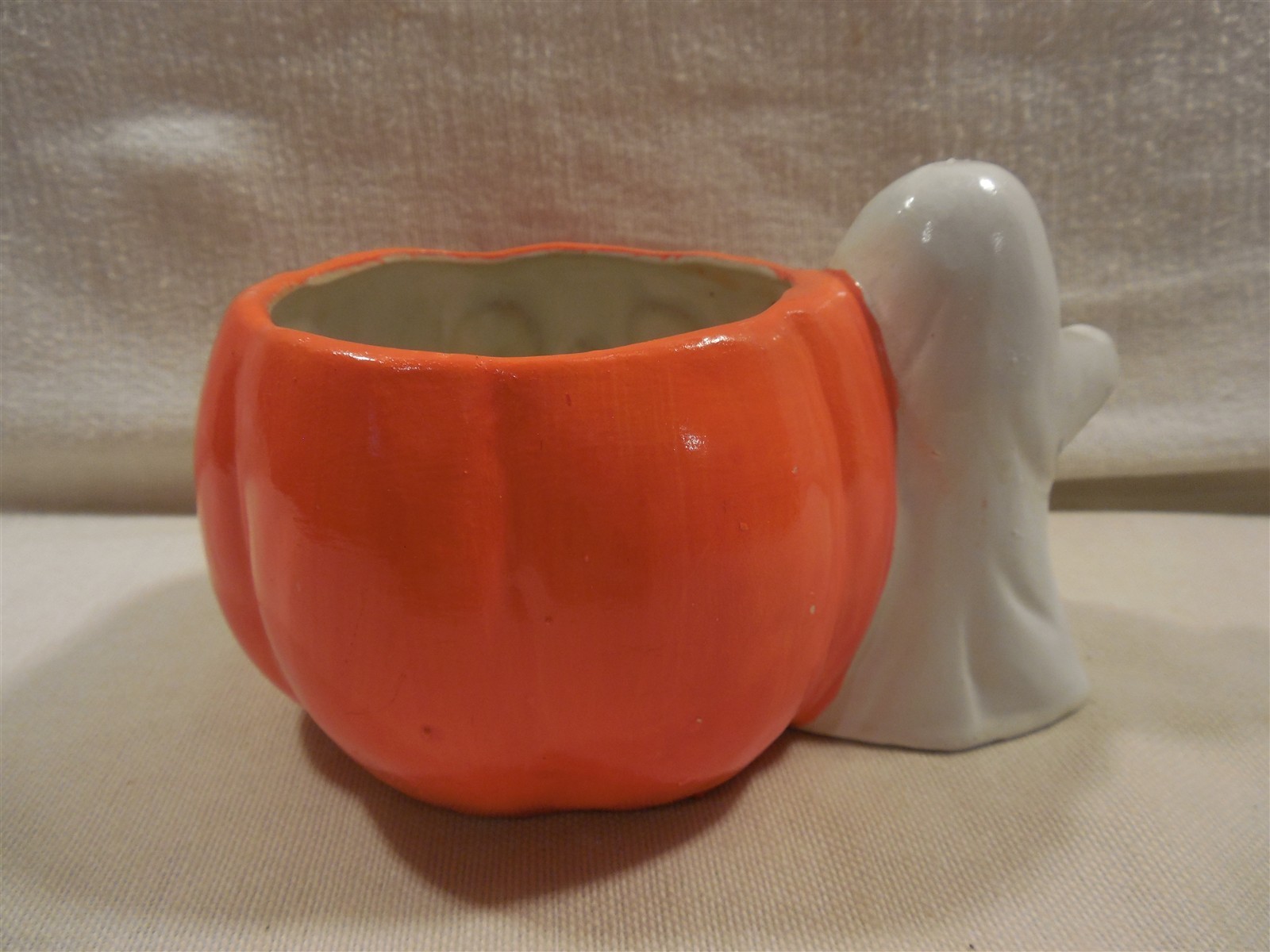 This is a vintage Ceramic Halloween Ghost Jack-O-Lantern Pumpkin planter (E-6827). The pumpkin has a great jack-o-lantern face with a Ghost. Not sure who manufactured the planter and if it was made in Japan or Taiwan as it is not marked. The bottom is marked E-6827. The planter measures approximately 3 1/2" tall and 6" wide. Super clean cute ceramic Halloween ghost jack-o-lantern pumpkin planter that displays absolutely great when sitting on a shelf!