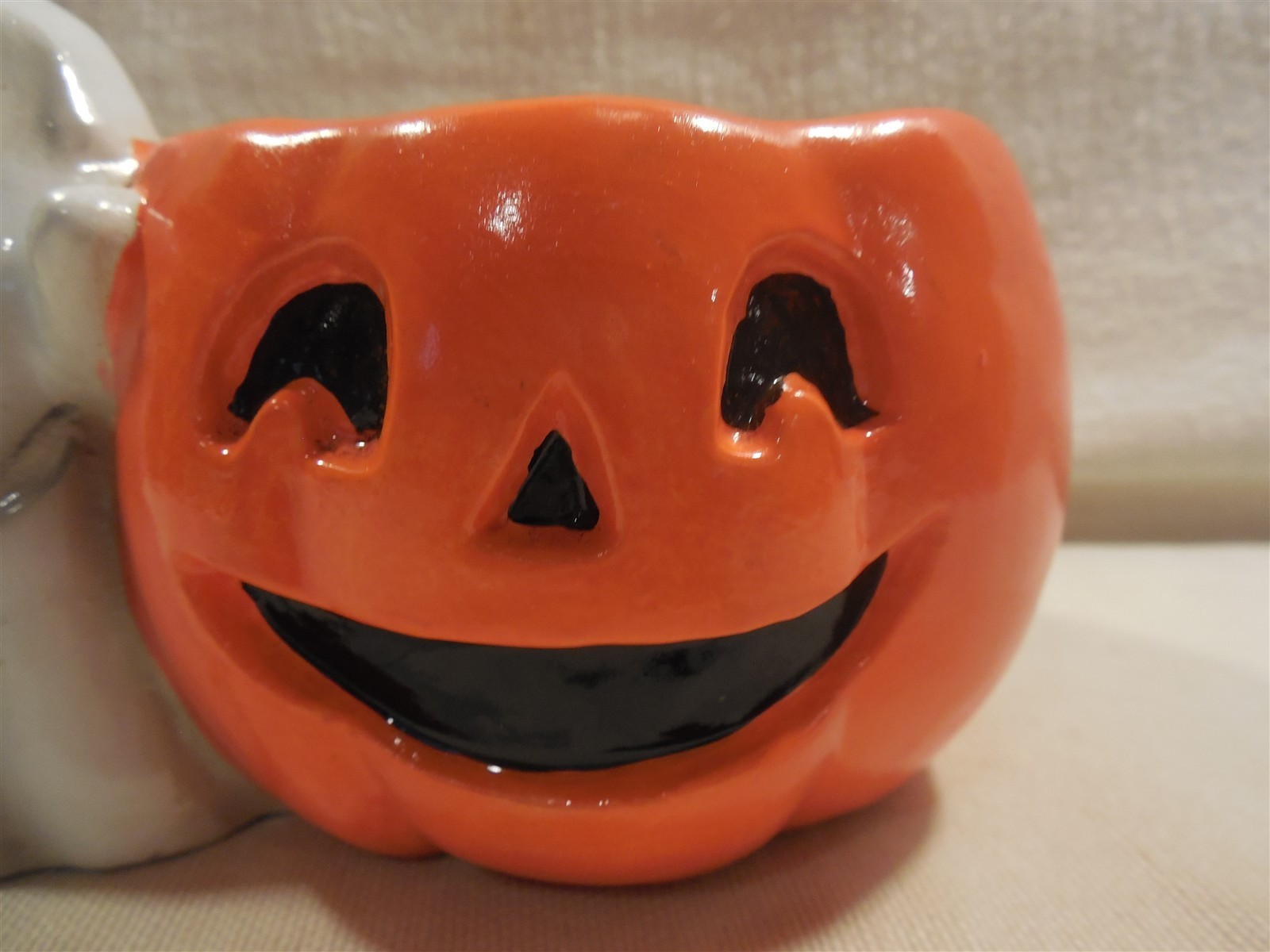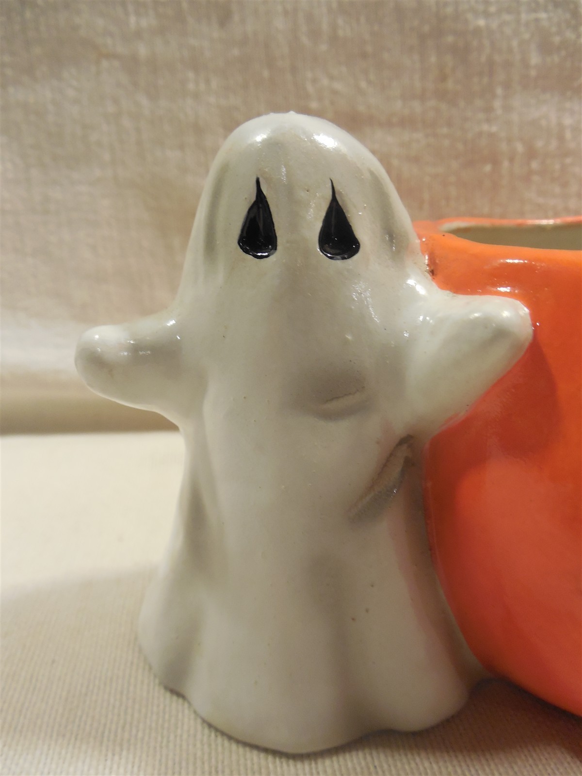 near Mint ceramic Halloween ghost pumpkin planter has no chips, cracks, fading or stains. Paint colors are strong with very minimal wear - no glaze crazing is apparent. Super clean cute ceramic Halloween ghost jack-o-lantern pumpkin planter that displays absolutely great when sitting on a shelf!